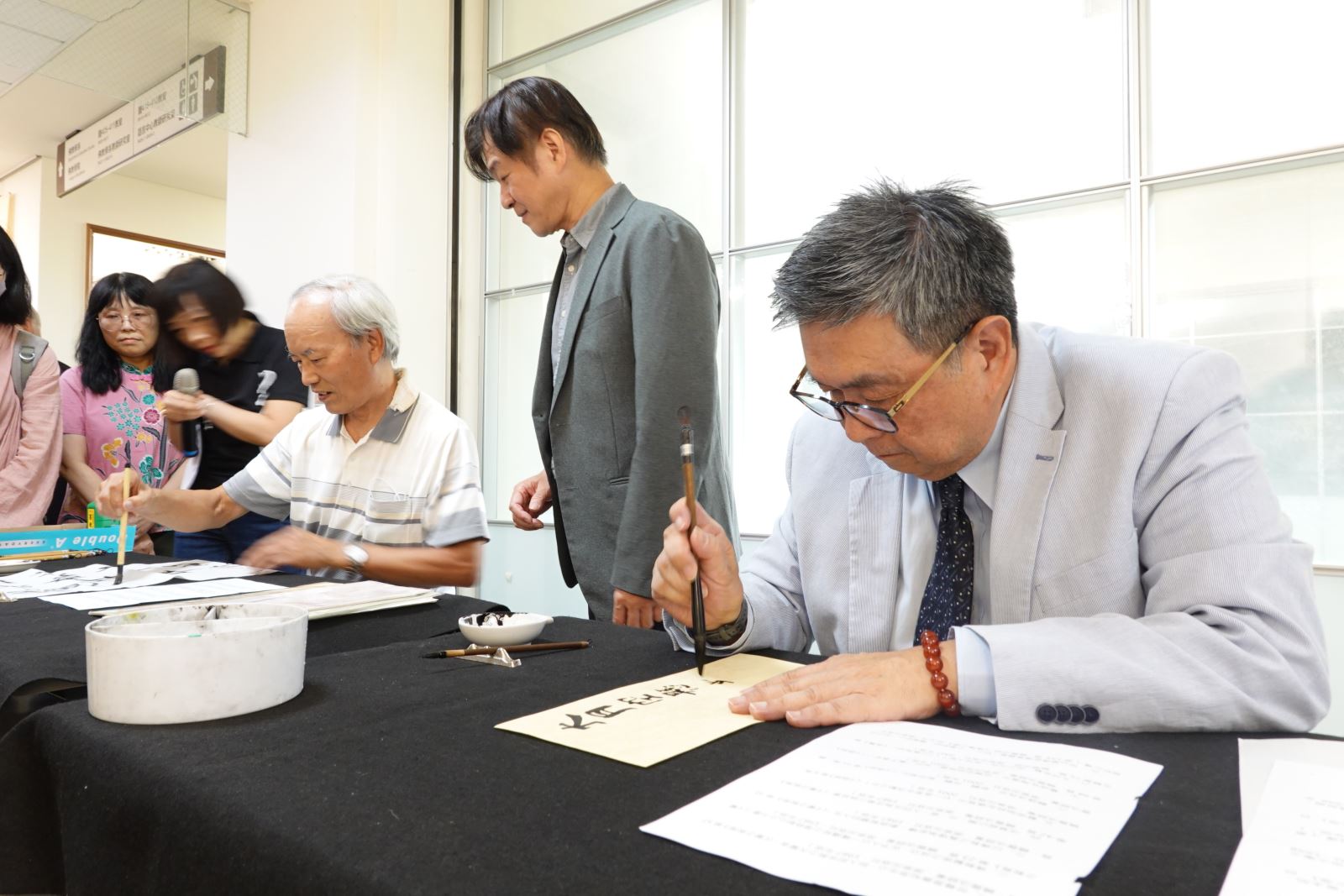 華梵大學李天任校長(右一)也親自下場揮毫,書寫創辦人曉雲導師法語。
