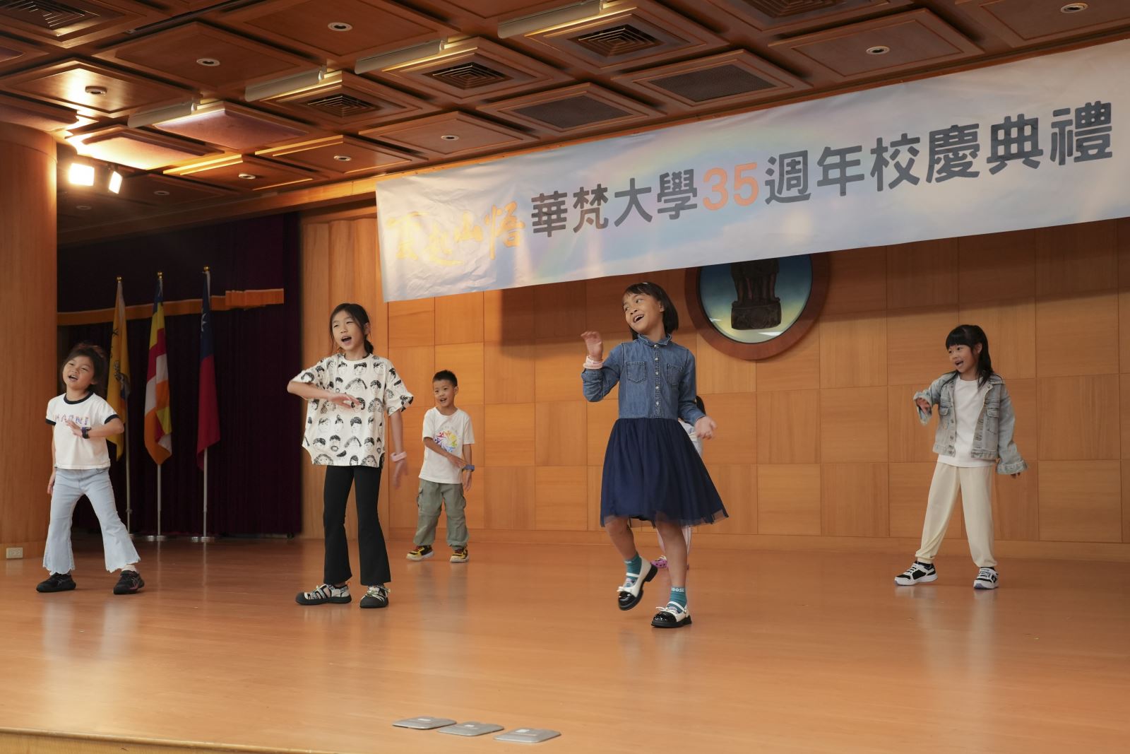 今日校慶典禮上,華梵大學也邀請原來學苑實驗教育機構的小學生進行歌舞表演,並頒發資深同仁服務獎與傑出校友獎。其中,運動健康中心金敏玲主任與董事會陳德旺組長代表獲頒服務滿30年資深同仁獎的教職員上台致詞,兩人細數對曉雲導師的懷念與感激,也對悟觀董事長帶領華梵團隊表達敬意。