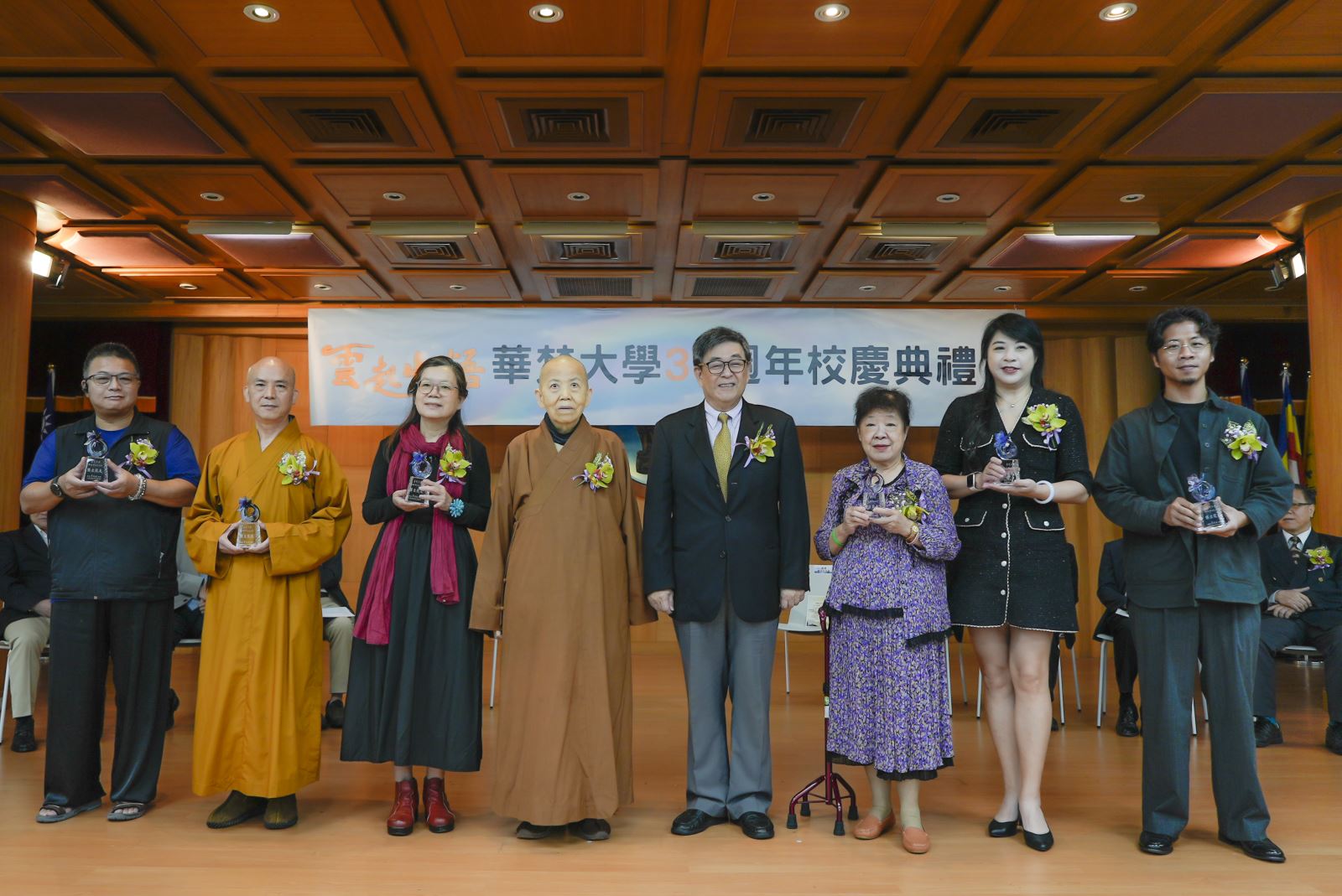 傑出校友獎今年由畢業於東方人文思想研究所博士班的尼泊爾慈恩佛學院院長吉祥法師、慈法禪寺暨法王寺教育長開照法師,以及畢業於佛教藝術學系碩士班的艋舺龍山寺板橋文化廣場佛畫班老師高鳳琴、豐源貿易公司負責人張凱棠,和畢業於工業設計系的黎明技術學院化妝品應用系副教授兼學務長王立鳳、沿岸有限公司創辦人兼創意總監陳彥安等六人獲得殊榮。