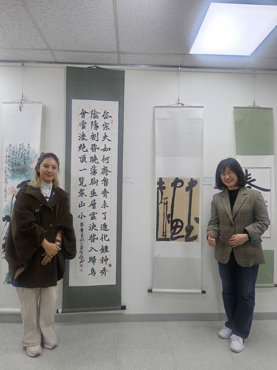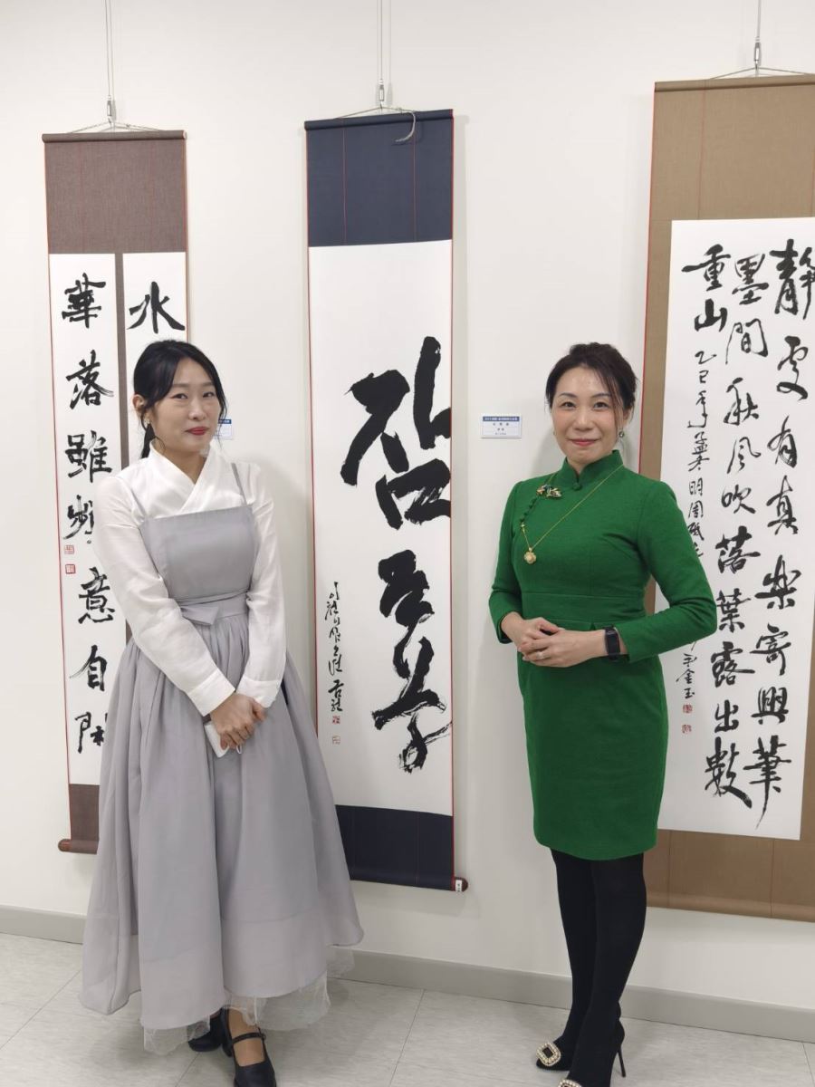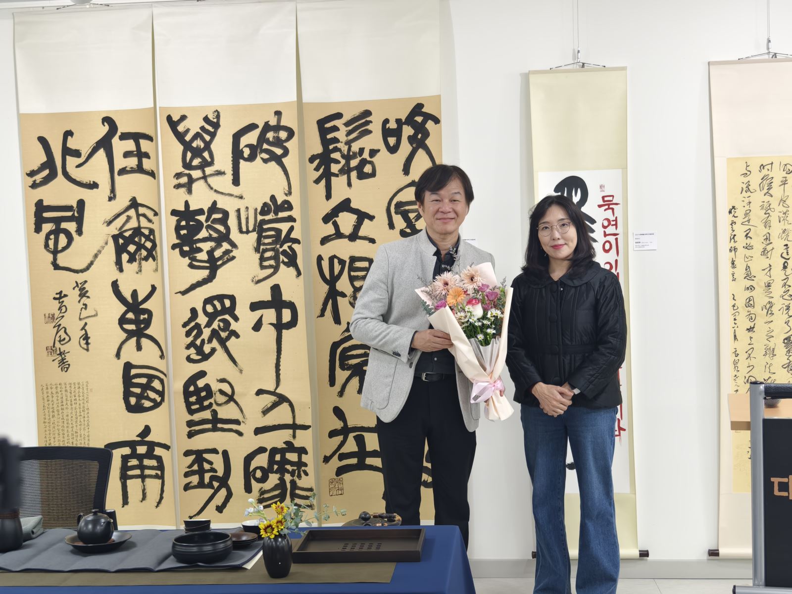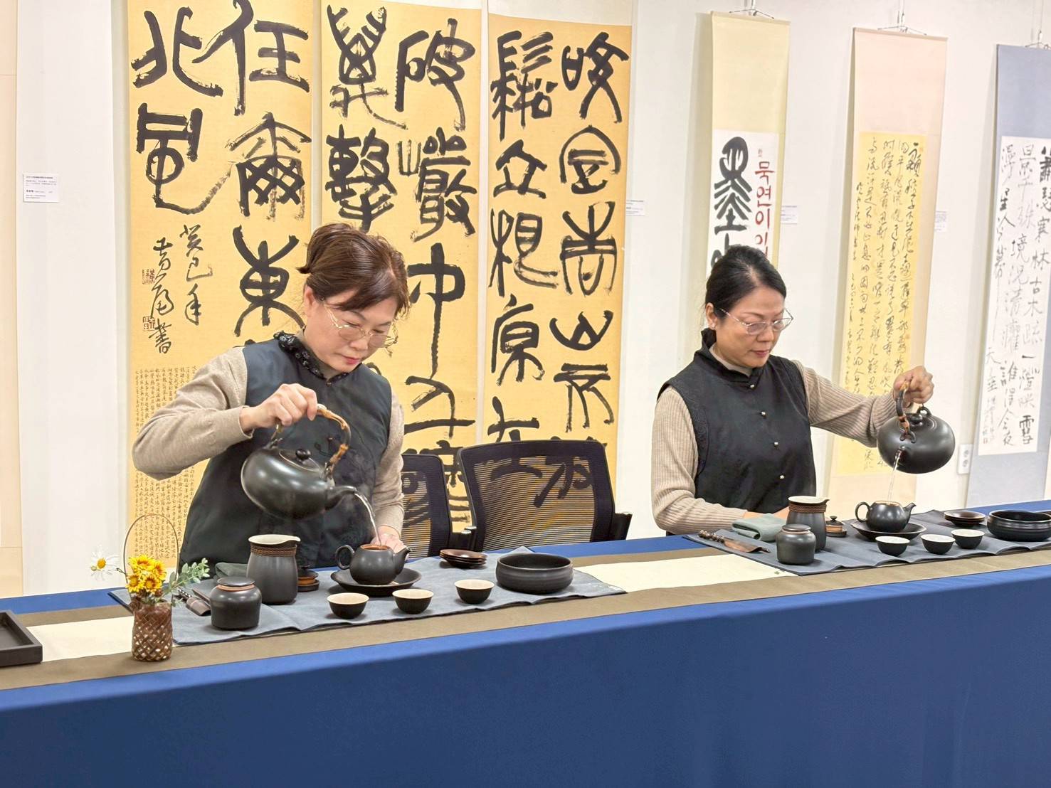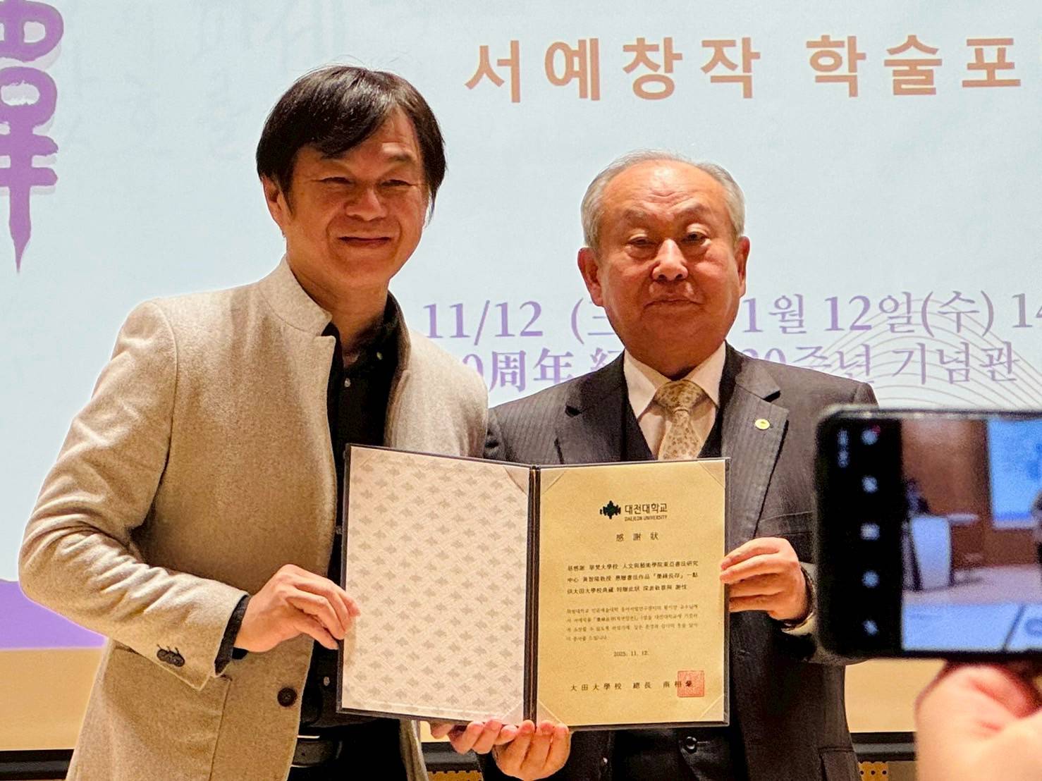 「2025台韓書藝校際交流邀請展」參展師生與貴賓合影。 華梵大學學生首度帶著書法藝術踏上韓國舞台!「2025台韓書藝校際交流邀請展」11月12日起於韓國大田大學書藝振興院隆重登場,台灣書藝名家黃智陽教授率領華梵在校生及校友親赴韓展出多件書法作品,以書藝之美向世界展現臺灣新世代的創作力與人文底蘊。 韓國大田大學書藝學科博士班一年級文載然(右)獻花給華梵大學參展人黃智陽院長,並在其作品前合影。 「2025台韓書藝校際交流邀請展」由華梵大學東亞書法研究中心與韓國大田大學書藝學科共同主辦,匯聚台韓兩地數十位書藝名家與青年創作者。其中,韓方由大田大學書藝學科學科長李周炯教授領銜,率領師生共34位書法家參與。 華梵大學參展師生團在韓國大田大學30週年紀念館前合影。 台灣則由華梵大學師生組團出展,除杜忠誥、李郁周、李蕭錕、黃智陽、聶蕙雲、胡九蟬、鄧君浩等多位重量級名家作品外,更有闕子暘等多名華梵校友,以及美術與文創學系、佛教藝術學系、智慧生活科技學系、東方人文思想研究所等9位在校生,一同參展30餘件作品,充分展現華梵書法教育薪火相傳的成果。 華梵大學參訪團學生進行精彩的茶道表演。 開幕典禮上,華梵學生與校友展現了一場精彩的「禪茶雙韻展藝交流」茶道表演,讓韓國的師生貴賓在品茗臺灣有機烏龍茶之際,也充分體驗華梵「新六藝」所培養的茶禪一味和覺察精神。現場茶香氤氳、氣氛溫雅,象徵書法與生活美學的融合。 華梵大學人文與藝術學院黃智陽院長(右)現場揮毫「大田墨緣」,致贈韓國大田大學書藝學科學科長李周炯教授。 此外,雙方亦舉行「書藝創作學術論壇」與創作觀摩活動,華梵大學人文與藝術學院院長暨東亞書法研究中心主任黃智陽教授除應邀發表專題演講「書法理論與創作的相對與相應」,並與大田大學李周炯教授現場揮毫,書寫「大田墨緣」、「海水盡墨」相互祝賀。 韓國大田大學書藝學科振興院鄭台喜院長(右)代表南相豪校長頒贈感謝狀給華梵大學黃智陽院長。 黃智陽院長更以作品〈墨緣長存〉贈予韓方,大田大學南相豪校長也特頒感謝狀,象徵兩校深厚情誼與書藝文化的長遠交流。 華梵大學美術與文創學系碩士班一年級崔毅同學(左)與韓國大田大學碩士研究趙允正在自己的作品前合影。 為深化文化體驗,華梵師生亦參訪韓國國立中央博物館、國立現代美術館與傳統文人故居等地,親身感受韓國從古典到現代的藝術演變,並從中汲取創作靈感,拓展國際視野。 華梵大學佛教藝術學系三年級張婷婷(左)與韓國大田大學書藝學科李周炯學科長開心在自己的作品〈四季〉前合影。 華梵大學表示,學生首次受邀赴韓參展,不僅是對華梵書法教育成果的肯定,更象徵臺灣新生代書藝力量的崛起,開啟華梵書法教育國際化的重要里程碑。 韓國大田大學書藝學科博士班一年級宋嬰瑟(左)邀請華梵大學東亞書法研究中心執行秘書陳昱蓉在其書法作品留影。