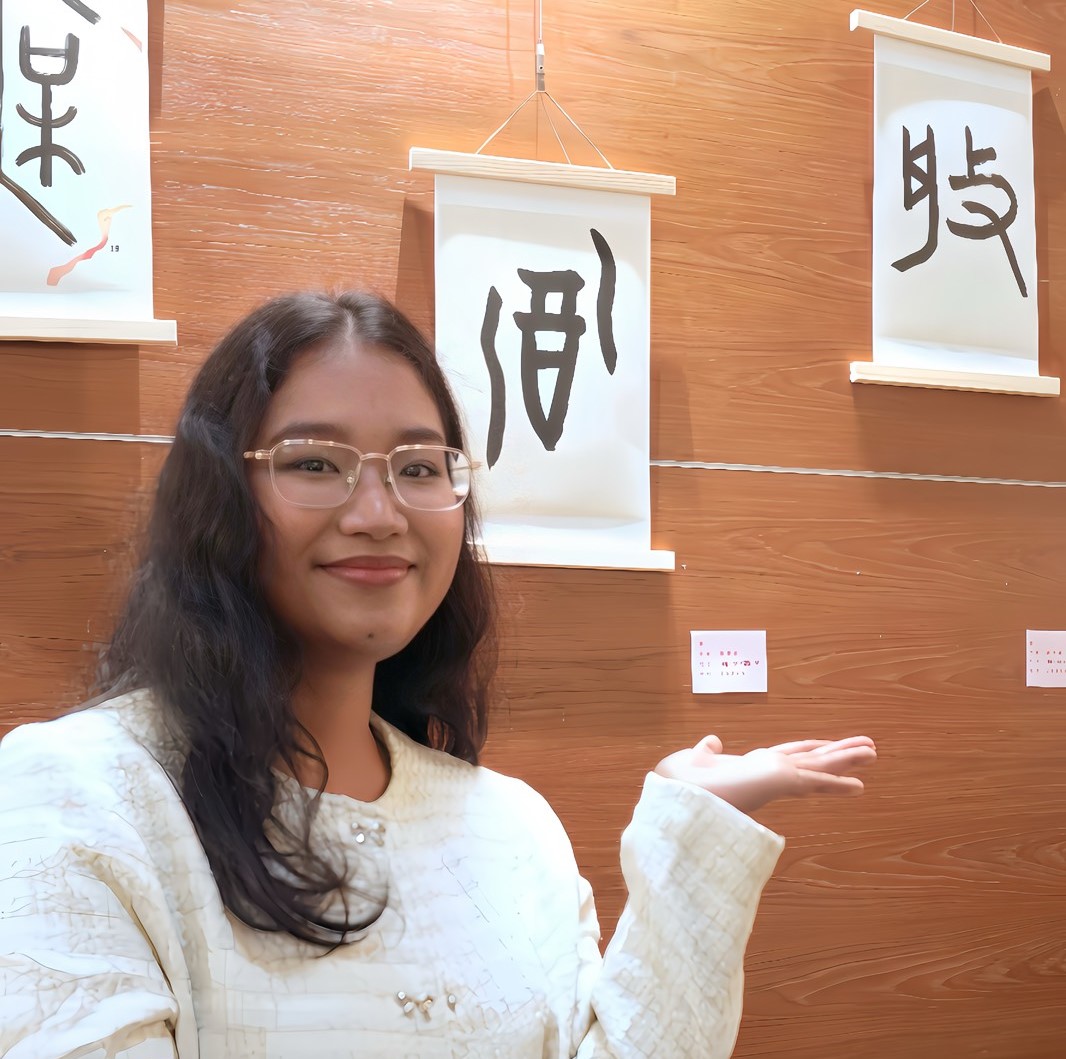 本課成果展策展人佛教藝術學系四年級陳慧銨作品。 誰說寫書法一定要臨摹字帖,不能打破窠臼?華梵大學圖資大樓三樓藝文空間現正舉辦「古文字的世界」書法藝術課程成果展,展現同學在古文字藝術創作上跳脫傳統、自由探索的精神,每件古文字作品都像生動的圖案躍然紙上,令人大開眼界。 張壯熙主任秘書開幕致詞。 開幕式邀請張壯熙主任秘書致詞,他對課堂成果給予高度肯定,並提醒,教育的價值不僅在技藝本身,更在於學生能透過不同老師、不同課程獲得多元的養分滋養,鼓勵同學保持開放心態,在學習中享受與人相處、彼此欣賞的過程。