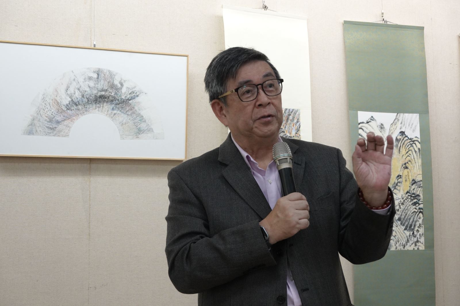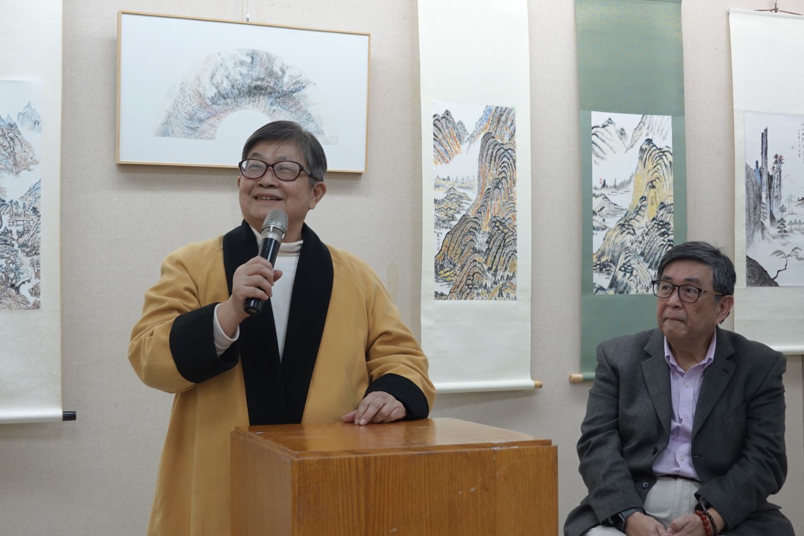 華梵文物館陳娟珠主任表示,大吳與小吳老師同為書畫藝術家,風格卻截然不同,小吳老師為巴黎第一大學藝術學博士,在傳統東方書畫的基底上又開拓出國際色彩與風格,令人眼睛為之一亮。大吳老師則打趣說,軒慧已經走出自己的路,「我現在不敢在家裡隨便評論小女了」。 被學生暱稱「大吳老師」的華梵佛藝系吳大仁助理教授致詞。