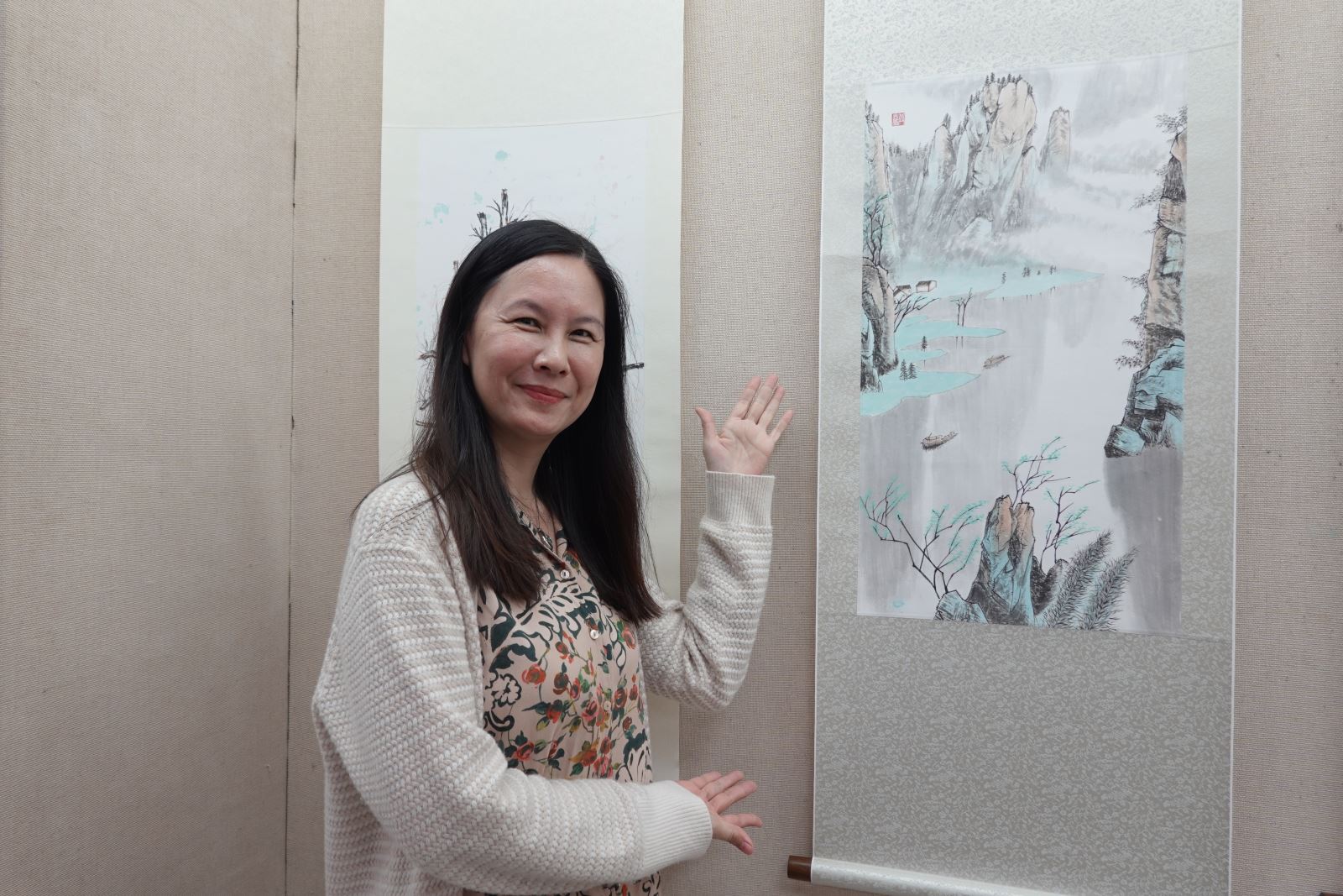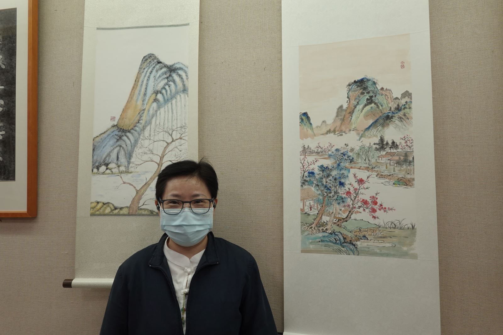 佛藝系二年級邱昱棋興奮直言,自己是從未接觸過寫意山水畫的「小白」,卻能一口氣展出四幅畫作;同班同學魏天嬌也感性分享,老師從素描、速寫開始,教大家了解光影和陰暗層次,再逐步引入皴法和渲染,讓沒有學過水墨的她畫出被先生喻為「鎮店之寶」的作品,真的眼界大開。 佛藝系二年級施玉雲展示自己在「寫意與技法」課堂中創作的玻璃畫。