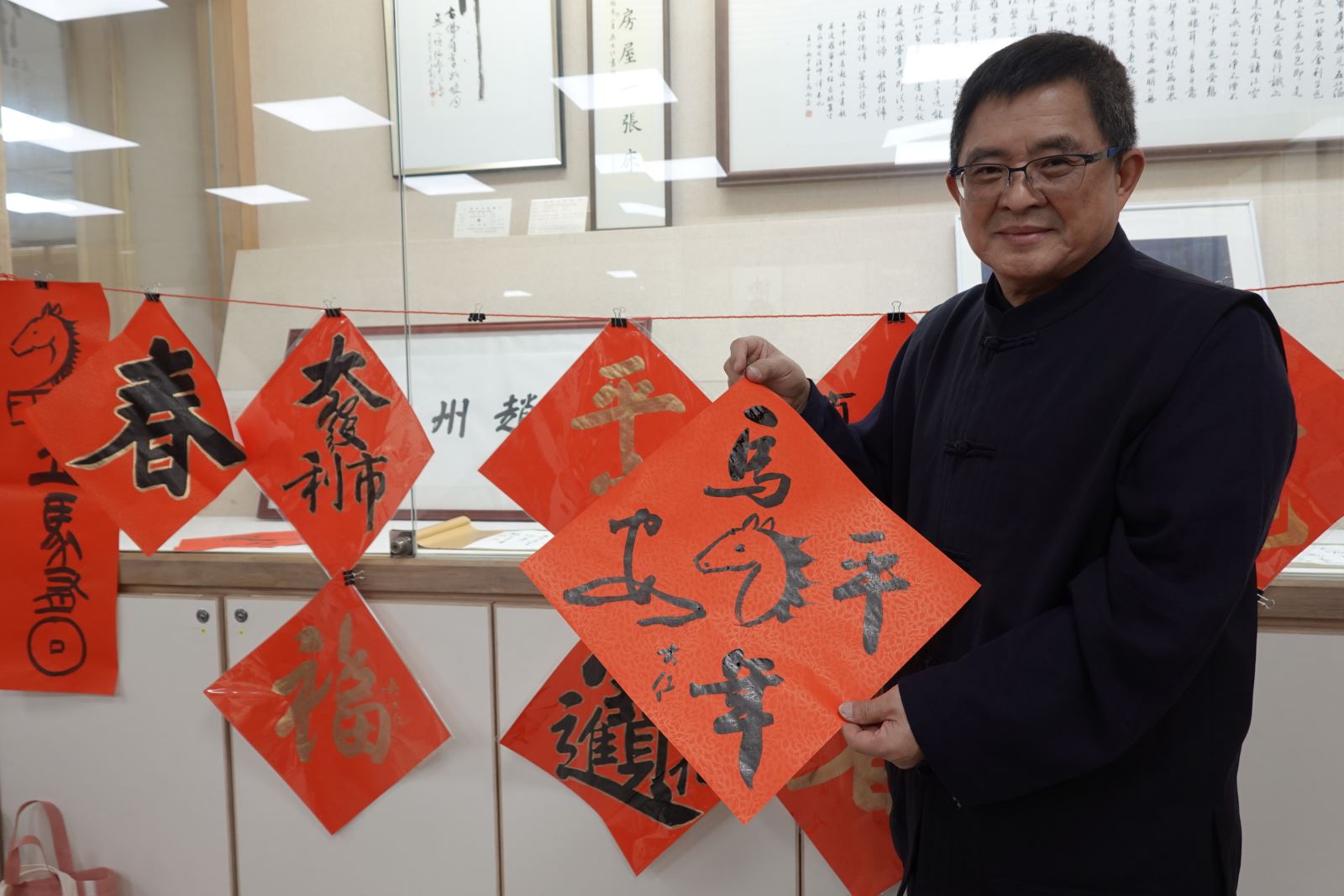 展覽開幕式後隨即舉辦「書寫春聯迎新歲」活動,邀請李天任校長開筆,吳大仁老師帶領通識課程「水墨繪畫實作」的學生在文物館集體揮毫,寫下「馬年平安」、「馬力全開」、「立馬有錢」等吉祥話,祝福大家2026馬年行大運,馬到成功。 華梵大學李天任校長開筆揮毫,為集體寫春聯活動揭開序幕。