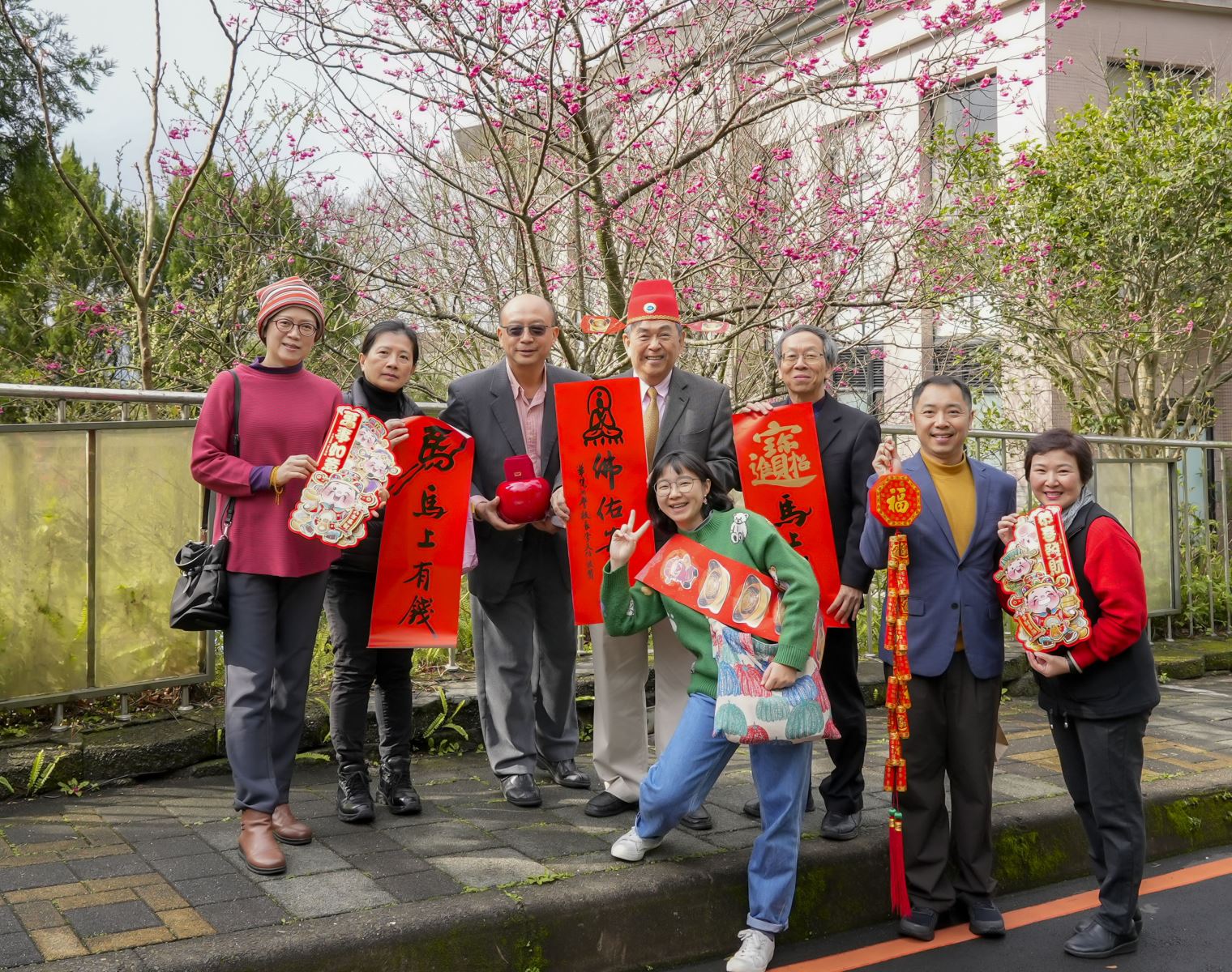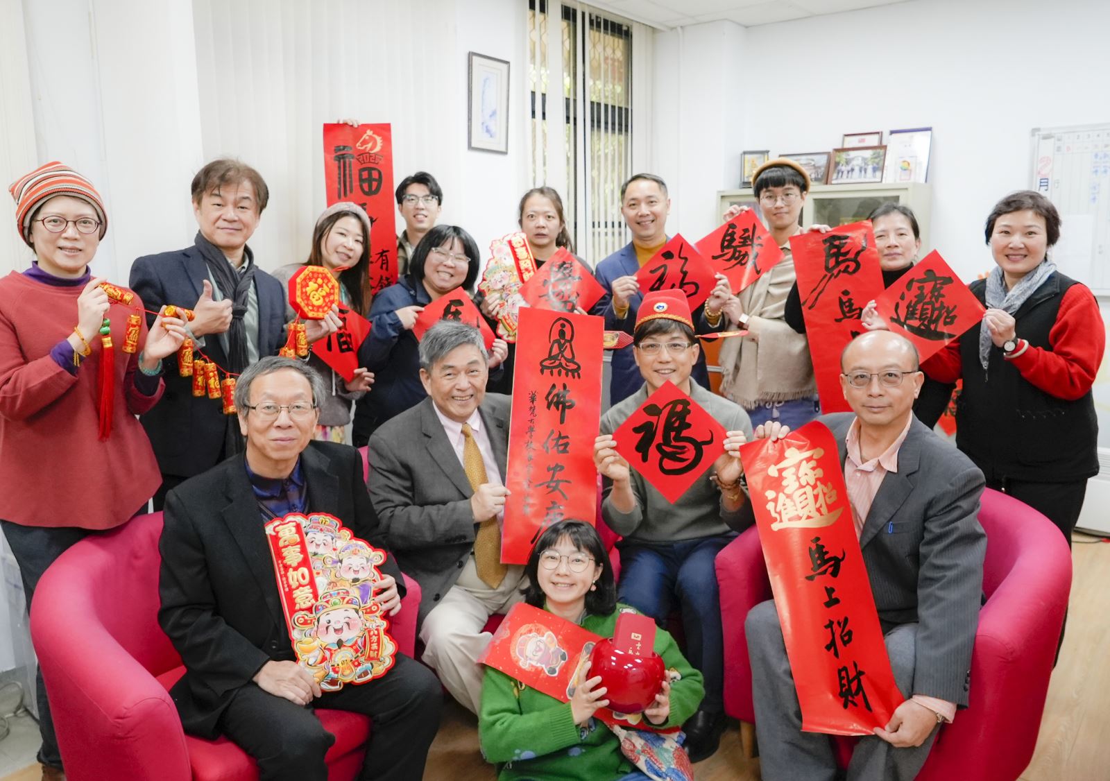 迎接馬年春節,李天任校長 ( 中 )扮財神拜年發紅包。 今日春暖花開,馬年春節即將到來,華梵大學李天任校長在過年前最後一個上班日,帶領一級主管與秘書室同仁走遍校園每一個角落,親自向堅守崗位到最後一刻、勞苦功高的華梵人拜年,並致上最高敬意與祝福。 華梵大學公共事務處全體同仁拜年。 為了讓華梵人沾染過年的喜氣,李天任校長還戴上精心製作的財神帽,以一身可愛的財神爺裝扮,帶著手拿賀歲春聯的張壯熙主任秘書、簡江儒教務長、黃智陽書院長與秘書室同仁們,為沿途遇到的每一位華梵人發送溫馨紅包,同時發揮腦筋急轉彎的機智創意,大開金口,針對每個單位與個人特質獻上獨門應景吉祥話。 華梵大學書院處全體教師同仁向大家拜年。 李天任校長祝福會計室「馬上有錢」、人事室「馬上有人」、佛藝系「佛佑安康」、運動健康中心「馬上健康」、警衛室「馬上平安」、未婚同仁「馬上有對象」,逗得人人笑逐顏開,喜氣拉滿,也為丙午馬年的開春迎來「馬上幸福」的好彩頭。