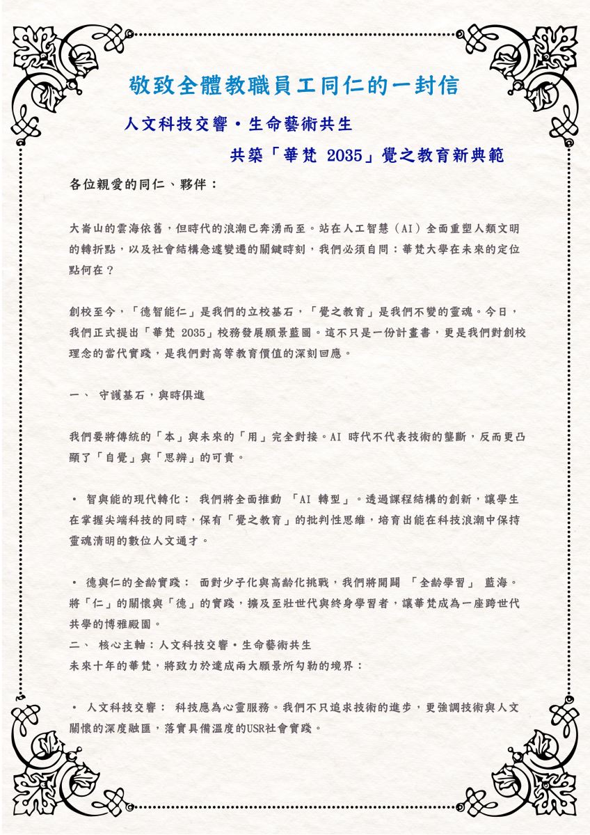 華梵大學李天任校長今日以公開信的形式,向全體教職員工發布「華梵2035」校務發展願景藍圖。 面對AI科技重塑文明的關鍵時刻,華梵大學李天任校長今日以公開信的形式,向全體教職員工發布「華梵2035」校務發展願景藍圖,未來十年將在既有的「覺之教育」基石上推動「生命覺醒」工程,透過AI轉型、全齡學習與國際移動,打造華梵成為AI浪潮中最懂生命意義的精緻博雅大學。