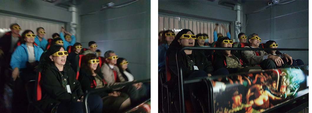 新北市高中校長在華梵大學「8D電影院」感受「瘋狂過山車」的飆速震撼。