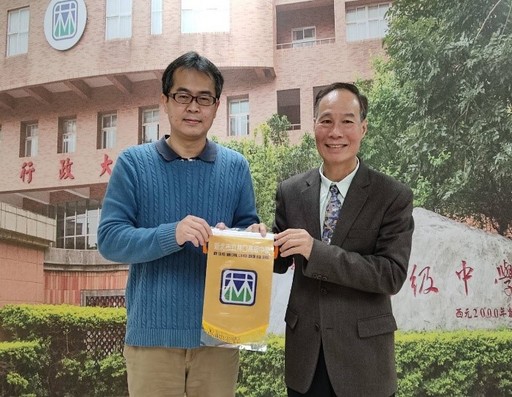 林口高中高栢鈴校長(右)致贈感謝旗給華梵大學智慧生活科技學院嚴建和院長,表達謝意。