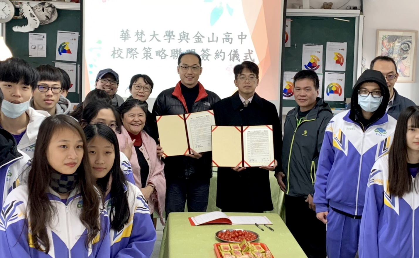 大學協助高中職發展多元課程是教育部積極推動的政策,華梵大學連續一年半至新北市立金山高中進行協同教學,教授高一學生美術創作、攝影與VR虛擬實境體驗課程,獲得師生好評,12日舉行學習成果發表會,兩校並正式簽署校際策略聯盟協議書,建立永續合作發展機制。