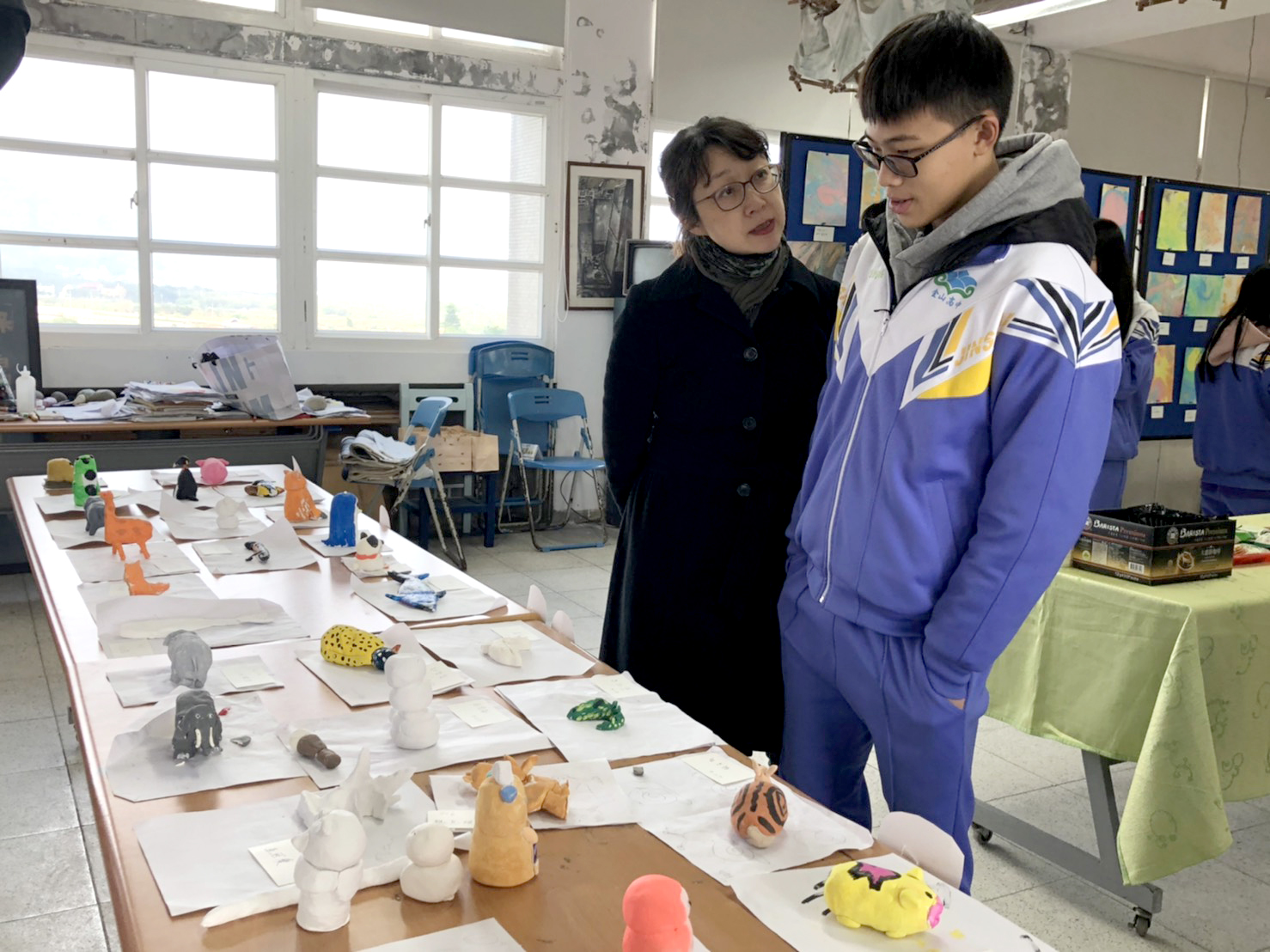 華梵大學美術與文創學系聶蕙雲主任(左)與金山高中學生討論作品。