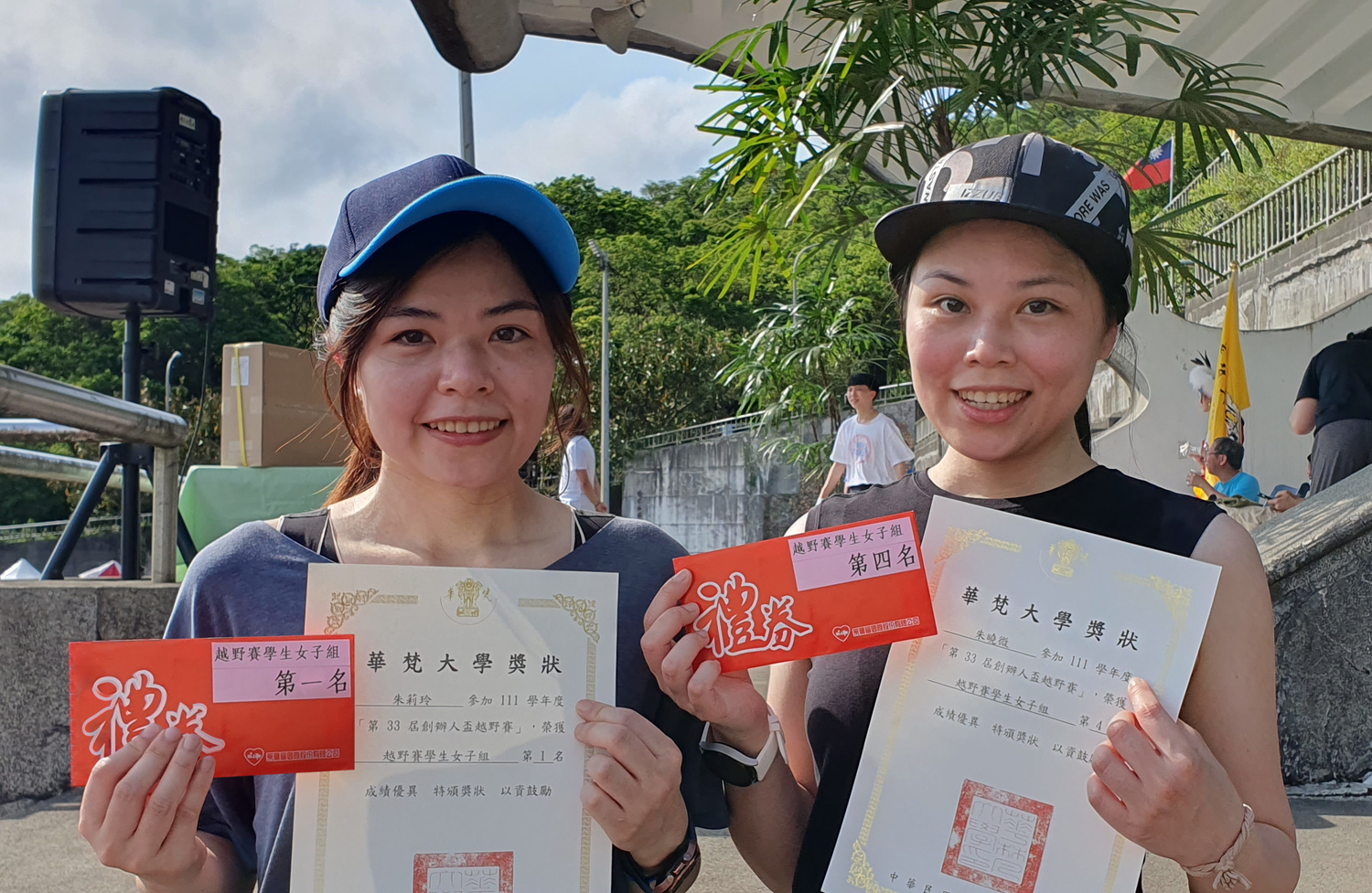 華梵校友曾怡雯(右)與賴彥廷專程返校參加越野賽,雙雙奪得冠軍。
