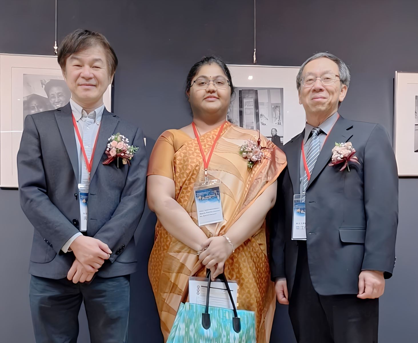 印度台北協會副會長甘泉女士(中)蒞臨開幕致詞,與華梵大學簡江儒教務長(右)、人文與藝術學院黃智陽院長合影。