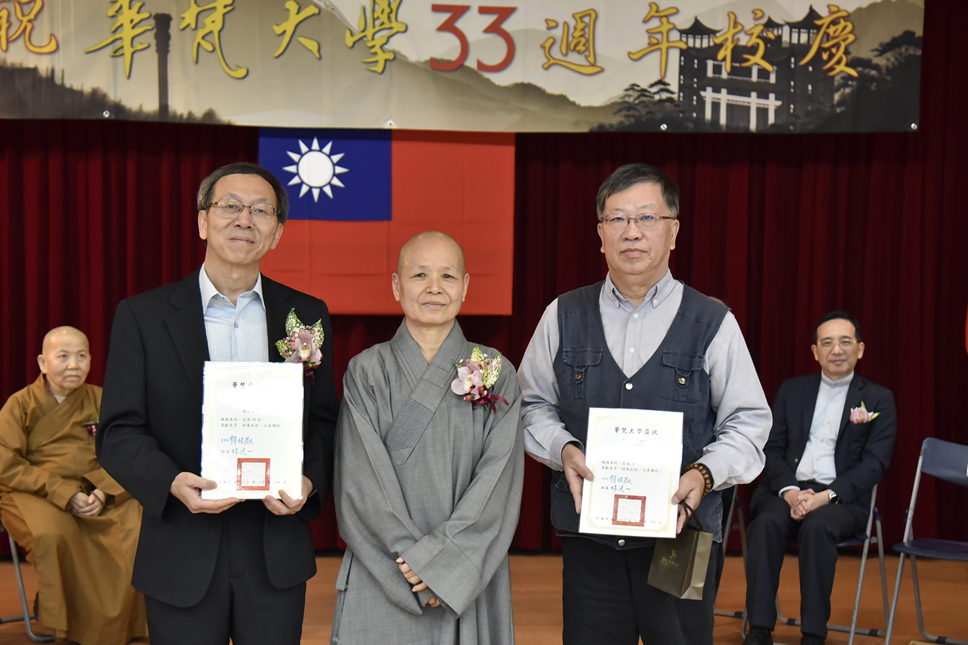 華梵大學董事長悟觀法師(中)頒發服務滿30年資深教職同仁獎給簡江儒教務長(左)與謝慶達教授。