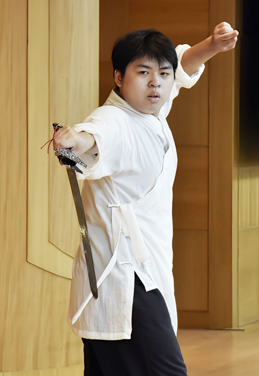2023臺灣世界盃武術錦標賽冠軍郭善元為觀眾演示三才劍,作為校慶典禮開場表演。