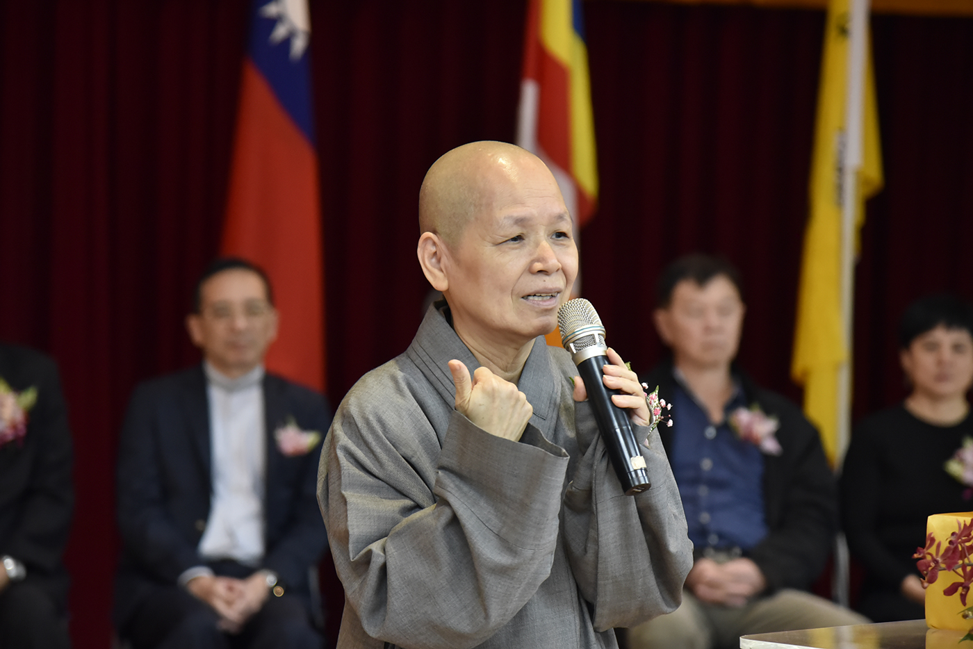悟觀董事長致詞表示,看到舞劍表演就想起文殊菩薩的智慧劍;人沒有智慧,慈悲就不夠菩薩性;沒有禪定,就無法湧現智慧與慈悲,而曉雲導師創辦華梵大學,就具足了慈悲、智慧與禪定三大功夫。