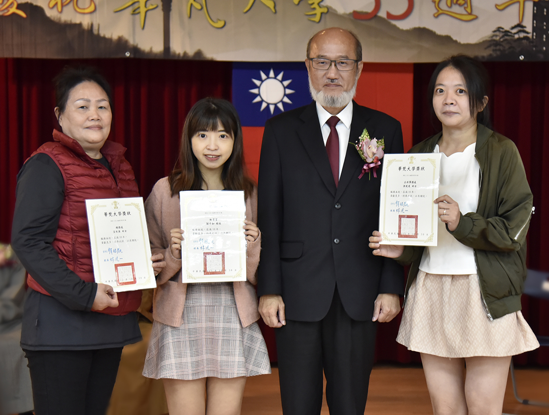 林從一校長(中)頒發112學年度傑出校友獎給東方人文思想研究所林碧麗校友(左)與美術與文創學系吳姿瑩校友。