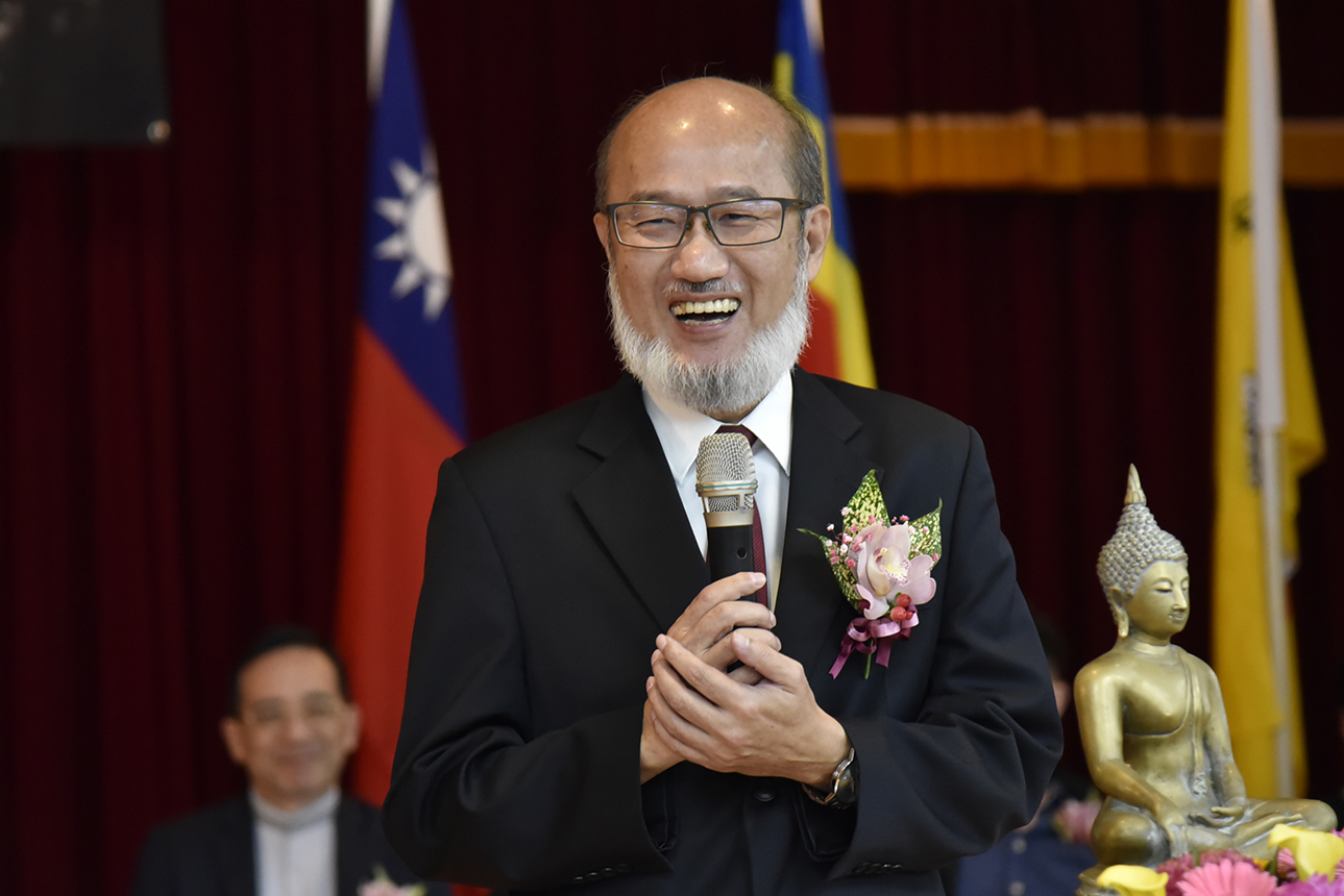 面對全校師生於如此喜悅的時刻歡聚一堂,悟觀董事長說,曉雲導師自比為一條教育的耕牛,於33年前以79歲高齡創辦華梵,要來耕耘這麼大的一畝田,我們應該學習做一條小牛,跟著大牛的步伐好好往前走,一棒接一棒努力,完成創辦人為完成的心願,能從工作中的到幸福感。