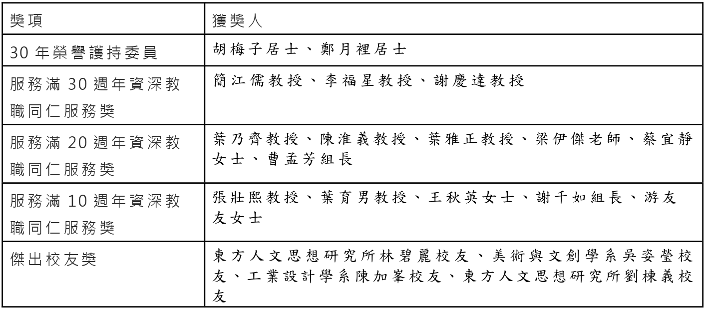 校慶典禮的重頭戲是頒發榮譽護持委員獎、資深教職同仁服務獎與傑出校友獎。簡江儒教務長榮獲服務滿30週年資深教職同仁服務獎,他上台致詞時激動地說,華梵大學是自己人生的第一份工作,30年前華梵工學院給他的錄取通知與第一份聘書,至今都還好好珍藏在抽屜裡沒有損壞。