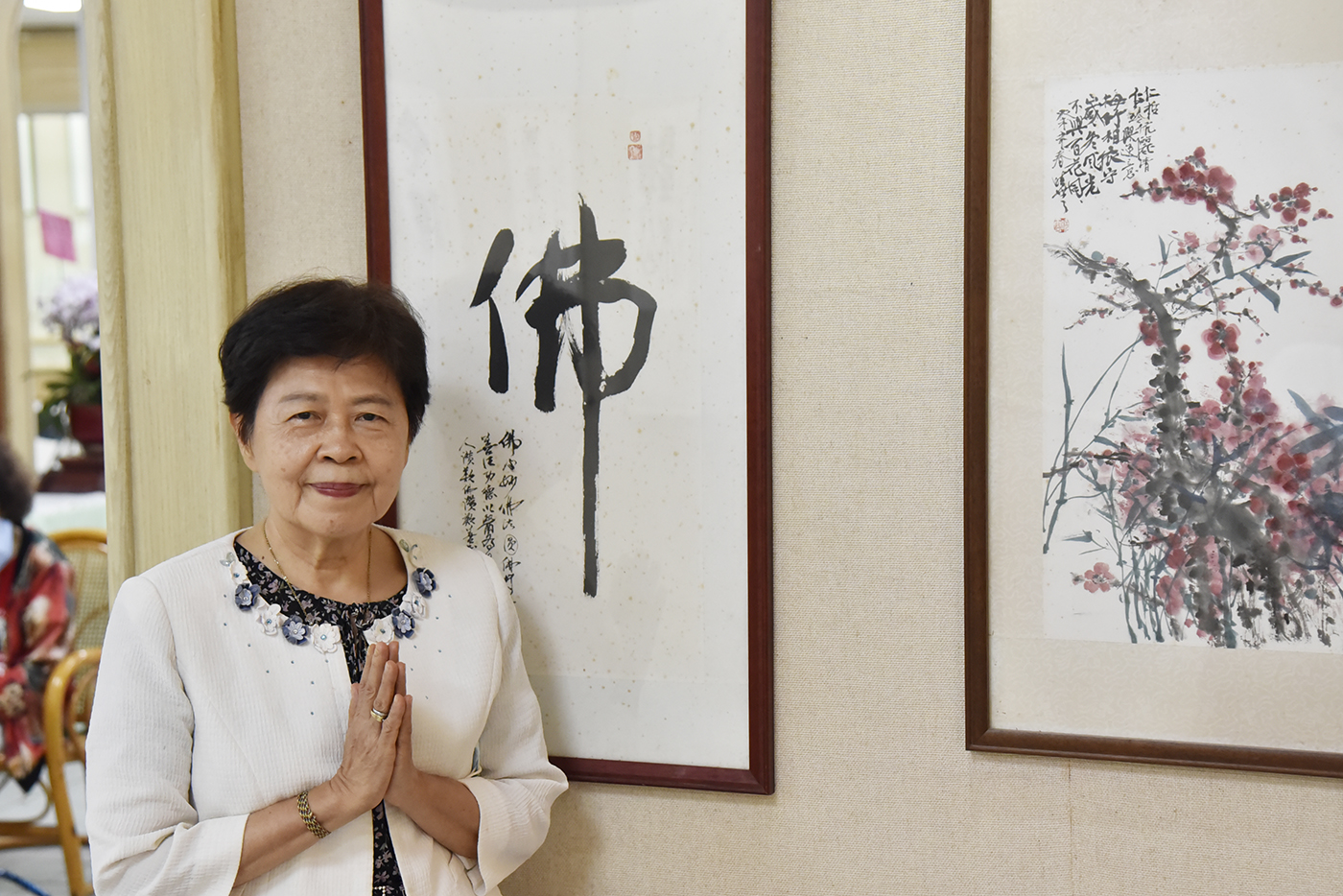 感念曉雲導師的恩澤,此次書法展中,蘇逸玲除了書寫曉雲法師創作的詞,還特別展出導師當年贈與她及夫婿、前華梵大學人事室主任王哲雄的三幅墨寶和畫作「梅竹相依」、「護理辛勞」、「佛心妙,佛法圓」真跡,更增添展覽的珍貴與豐富性。