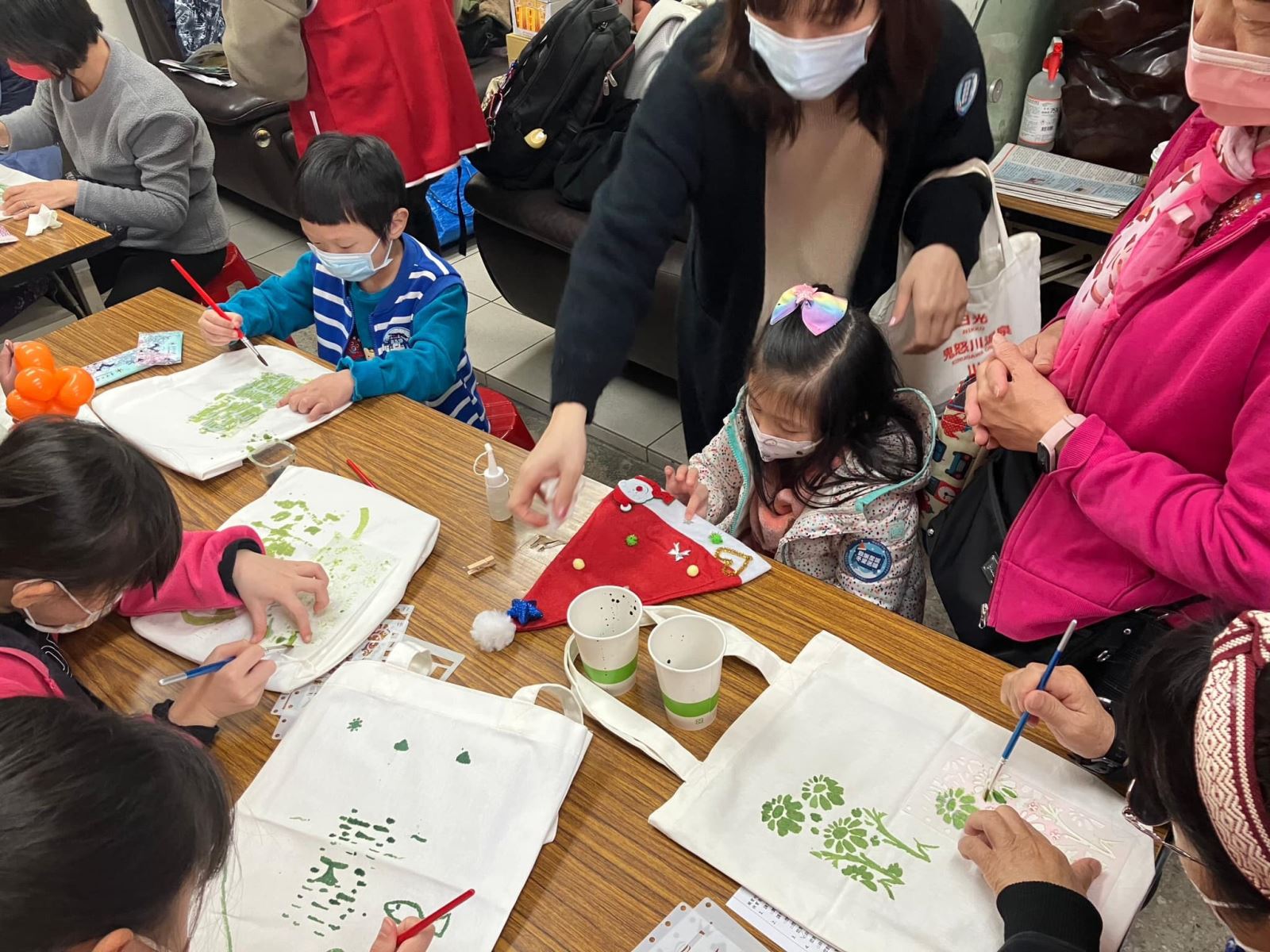 孩童們很開心的進行DIY植物染環保袋及妝點聖誕帽。
