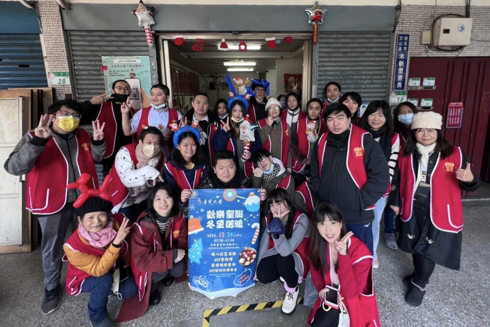 12月24日耶誕節前夕,華梵大學書院教育處課外活動組與運動健康中心,共同輔導美術與文創學系系學會,帶領系學會與學生社團新舊任負責人共31人,至臺北市文山區木新里里辦公處,辦理學生社團薪傳交接與社區服務活動。