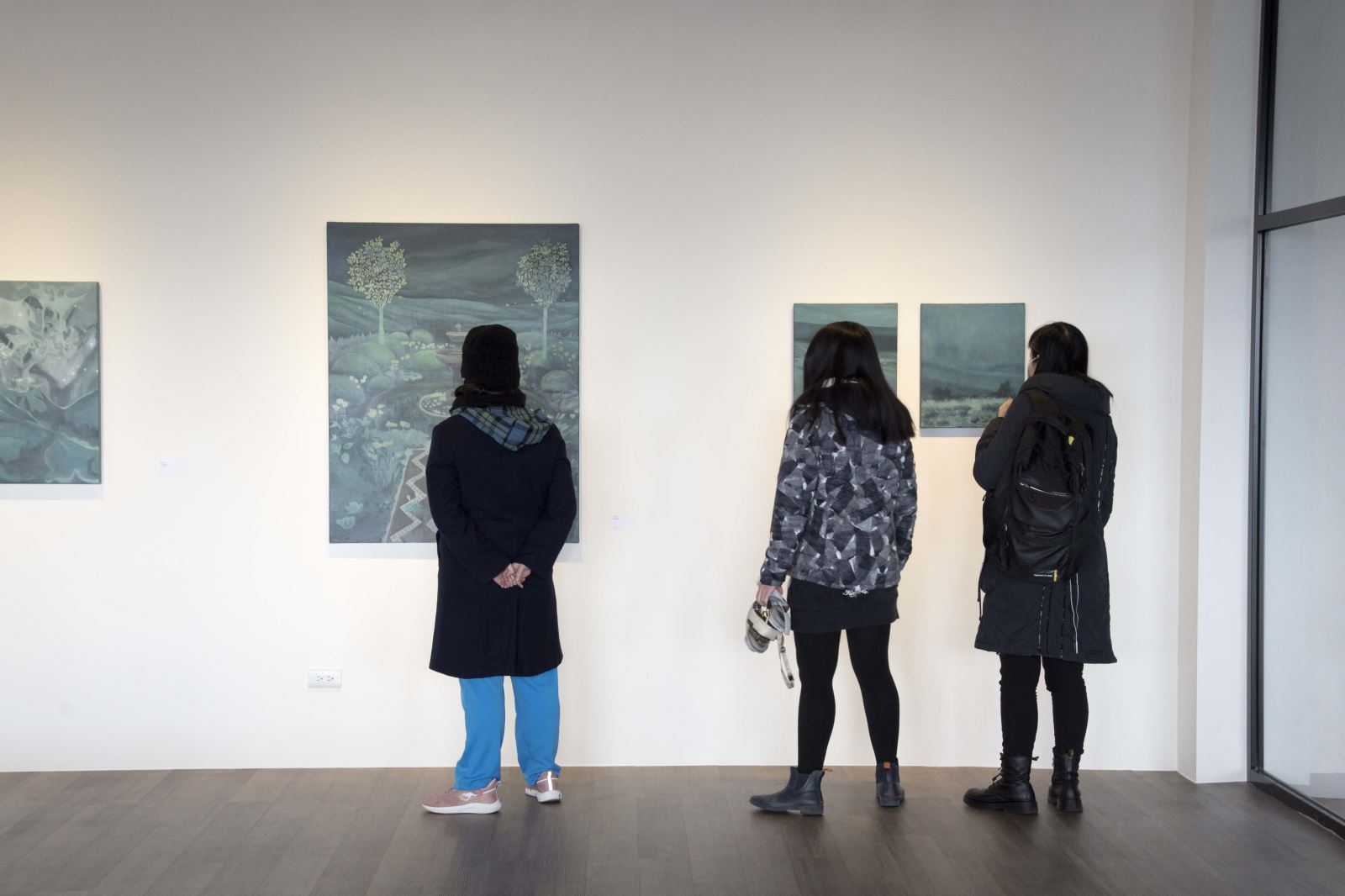 「初聲」大三創作展,參觀者細心欣賞作品。