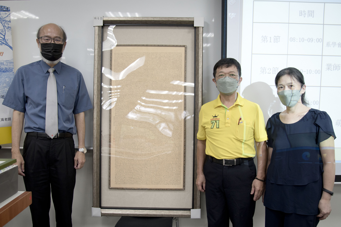 彭森明居士(中)及其妻致贈太虛大師金剛經給華梵大學。