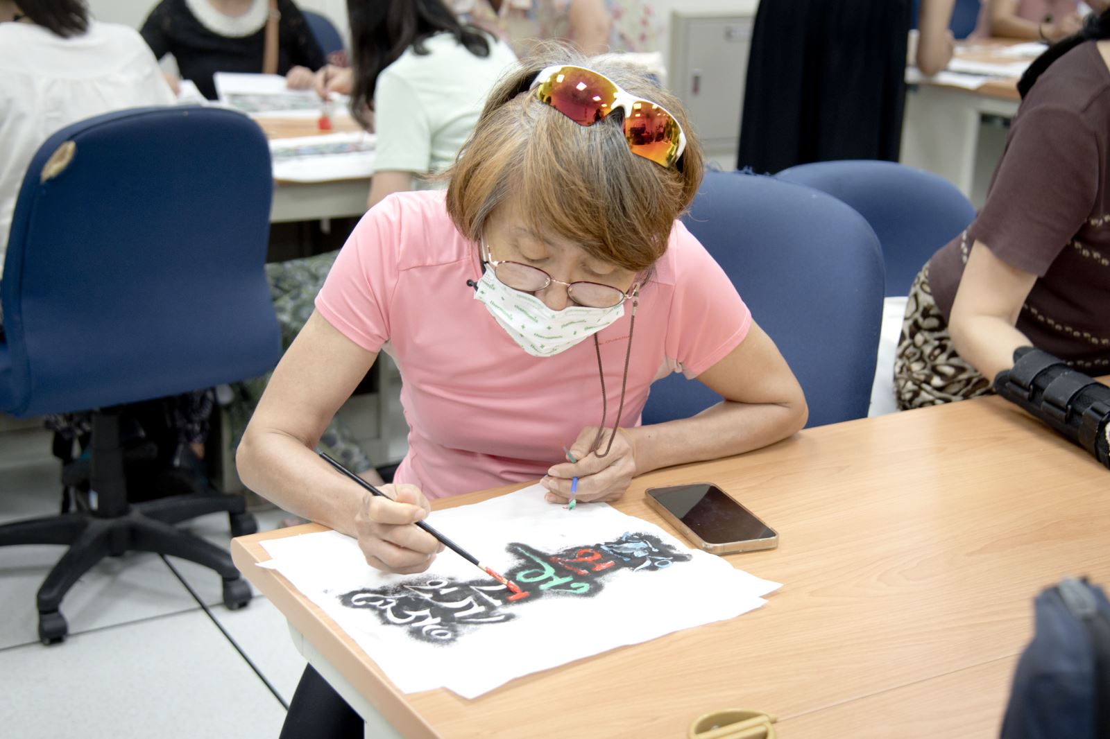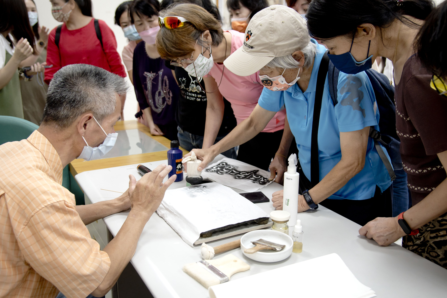 湖畔畫會畫家體驗拓碑「六字大明咒」。