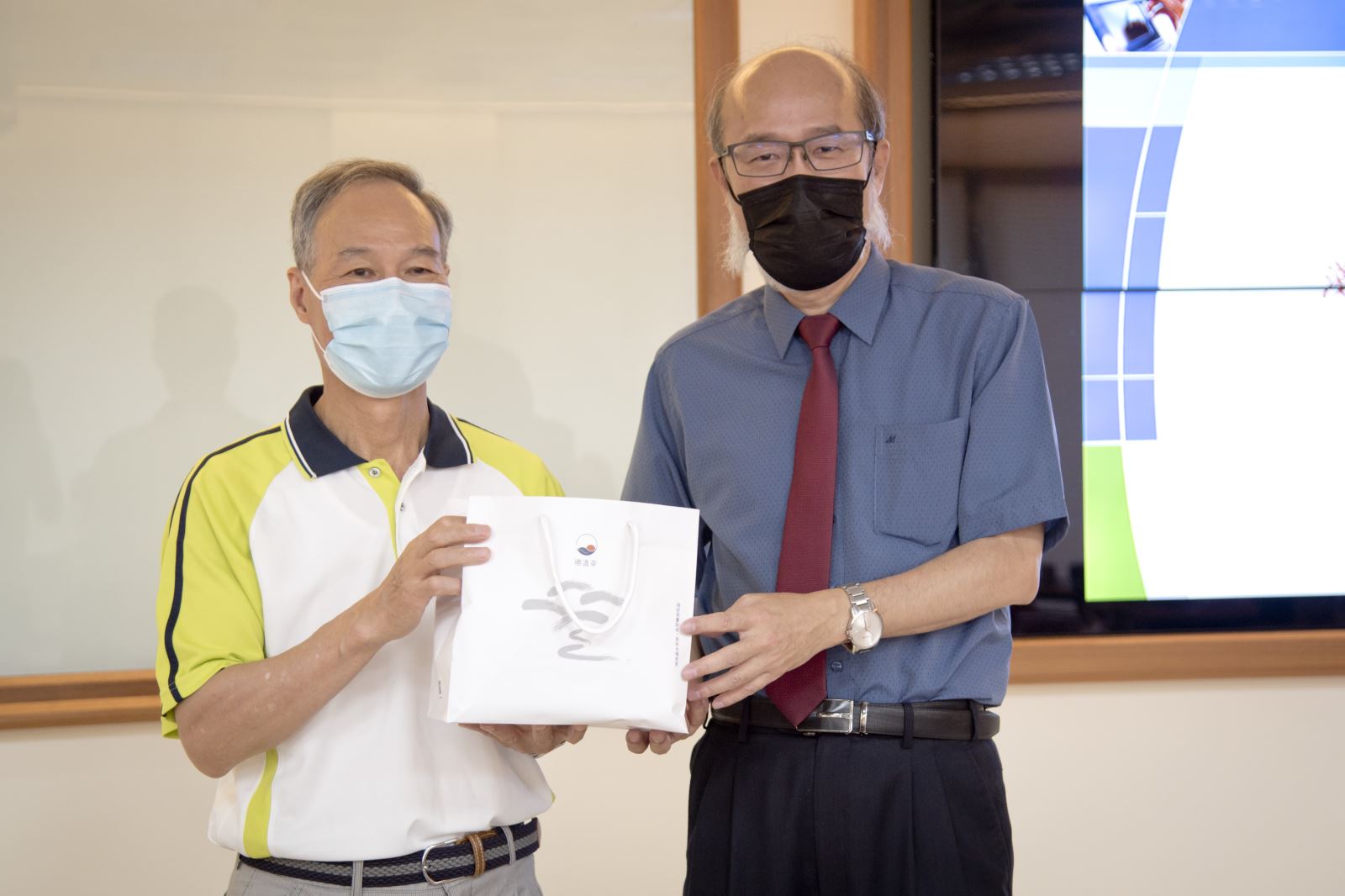 新北市高中職校長團參訪華梵大學,林從一校長(右)特別致贈紀念品,由林口高中高栢鈴校長(左)代表受贈。
