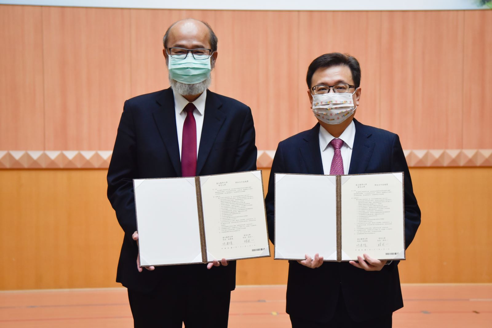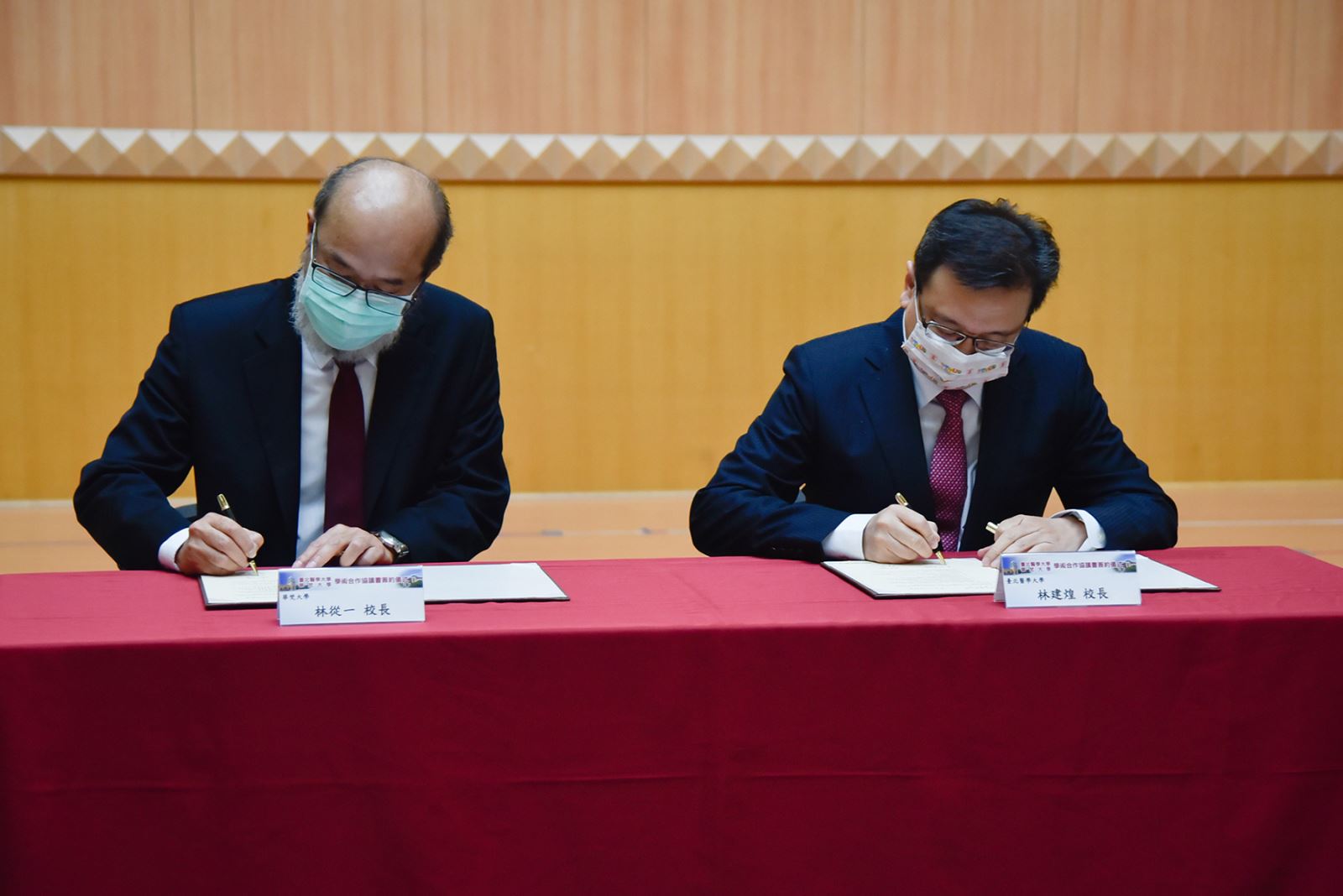 臺北醫學大學林建煌校長(右)與華梵大學林從一校長簽署學術合作協議。