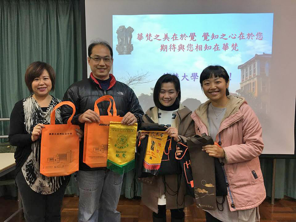 (左至右)華梵大學國際交流中心金敏玲執行長、黃明義學務長、佛教孔仙洲紀念中學吳美蘭老師、陳嘉寶老師。
