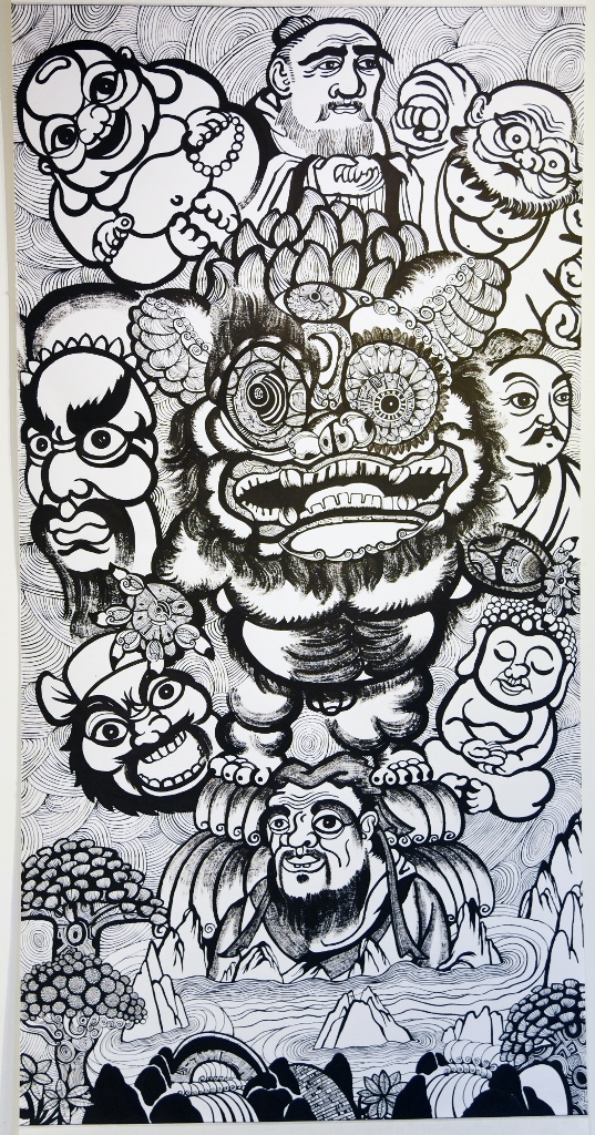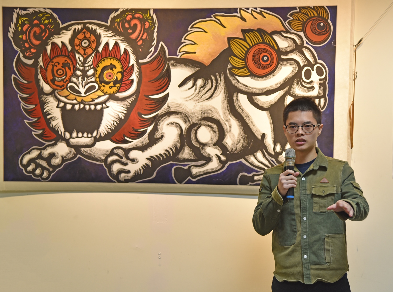 最近走進華梵大學圖書資訊大樓的師生,都會被懸掛在牆上一整排威猛有力、虎虎生風的巨大神獸創作所吸引,忍不住停下腳步仔細端詳,殊不知創作者竟然是一位個頭不高且長相斯文的小男生。當大眾聽完他的創作故事後,無不嘖嘖稱奇,對他的藝術爆發力讚賞不已。