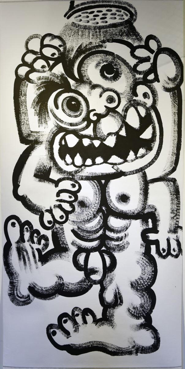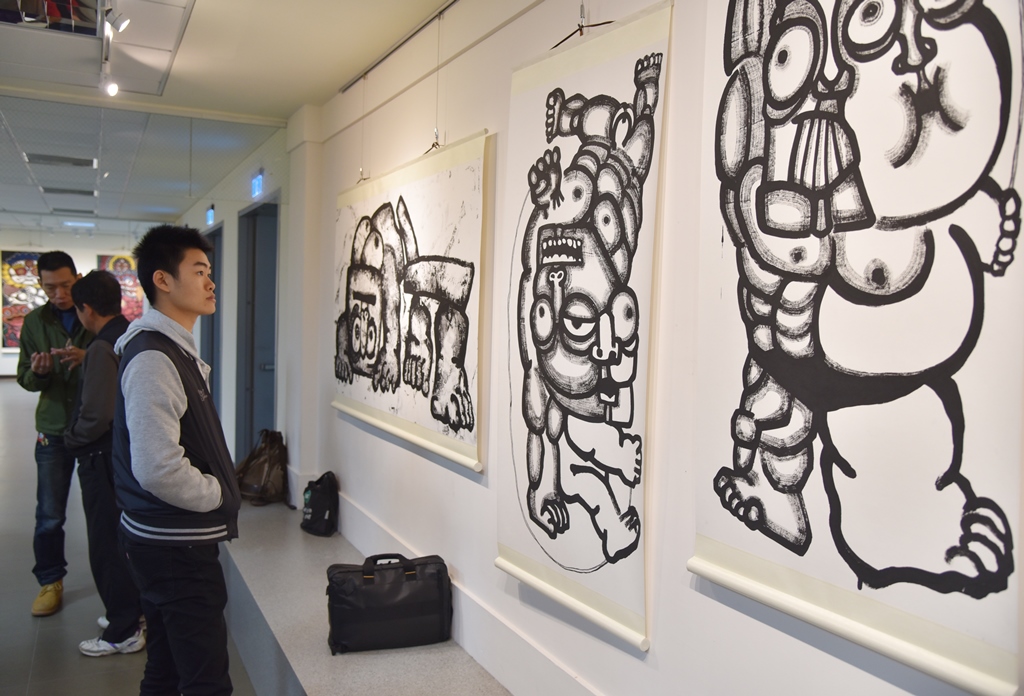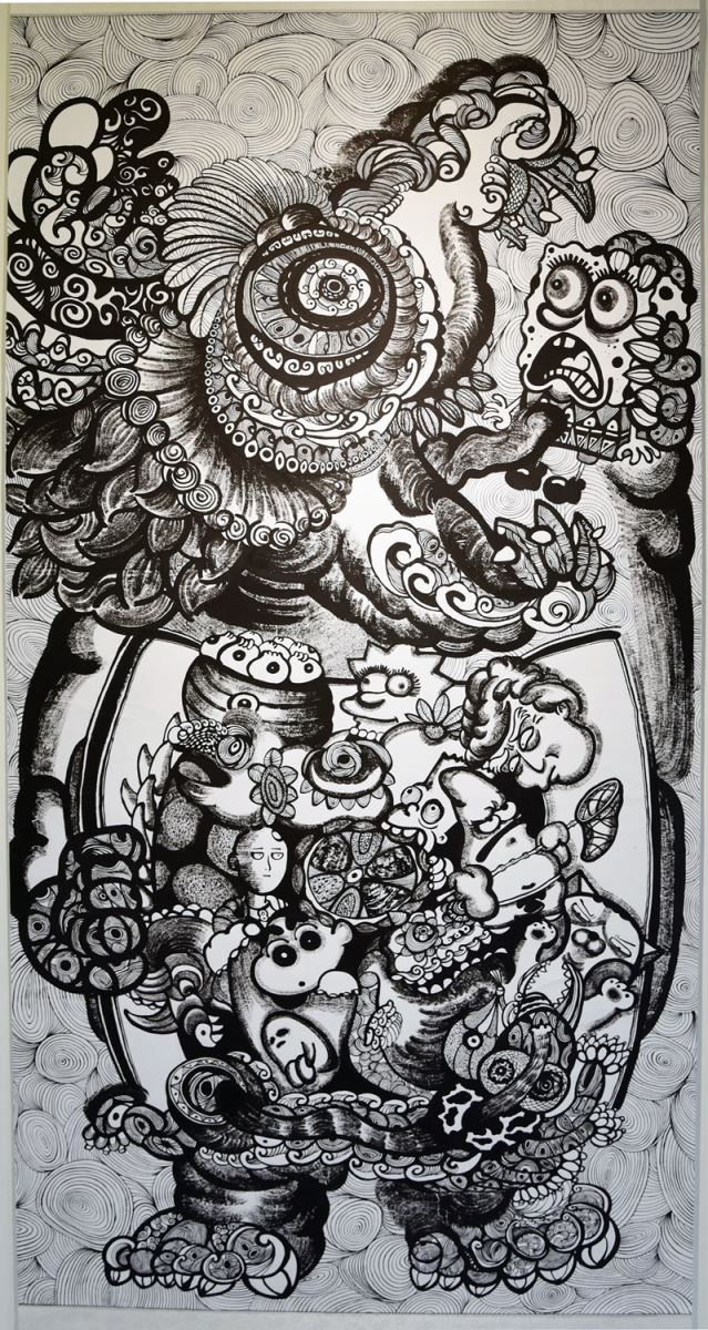 首次辦理個展的劉康彥並逐一向觀眾解說作品,其中最吸睛的一幅「大胃王」,將時下最流行的動漫主角如蠟筆小新、派大星、霸子(辛普森)、川普(辛普森版)、一拳超人(男主角崎玉)、白爛貓等全部吃進神獸肚子裡,以不加一滴水的濃墨融入工筆畫細膩又有力的筆法穿插組合,既逗趣又傳神,參觀者都忍不住在畫作前尋找究竟裡頭還藏了多少個卡哇伊的動漫人物,並且好奇這張創作的發想為何。