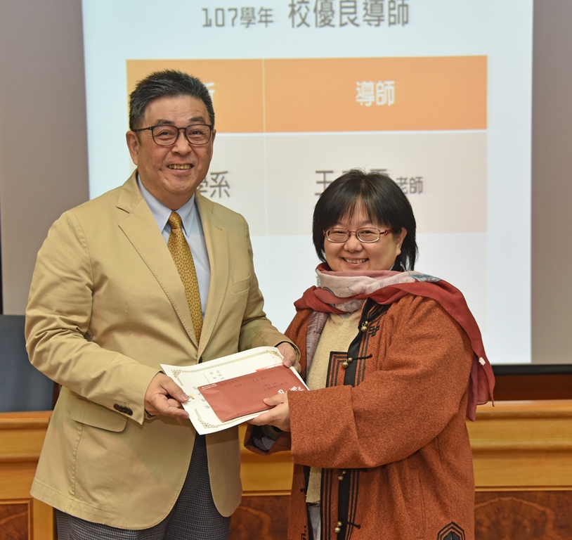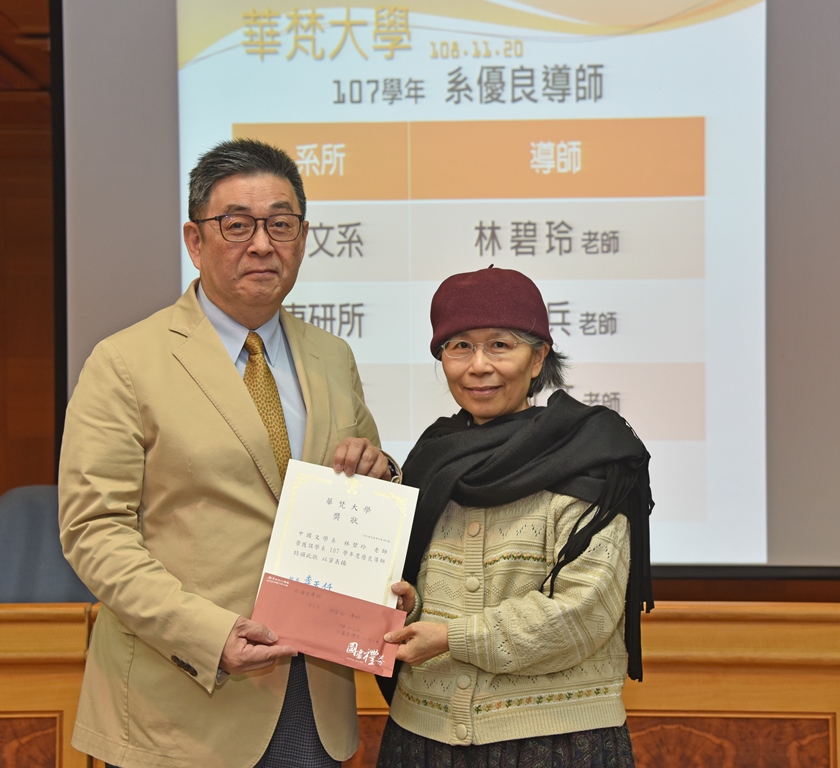 中國文學系林碧玲教授(右)榮獲「107學年度系優良導師」。