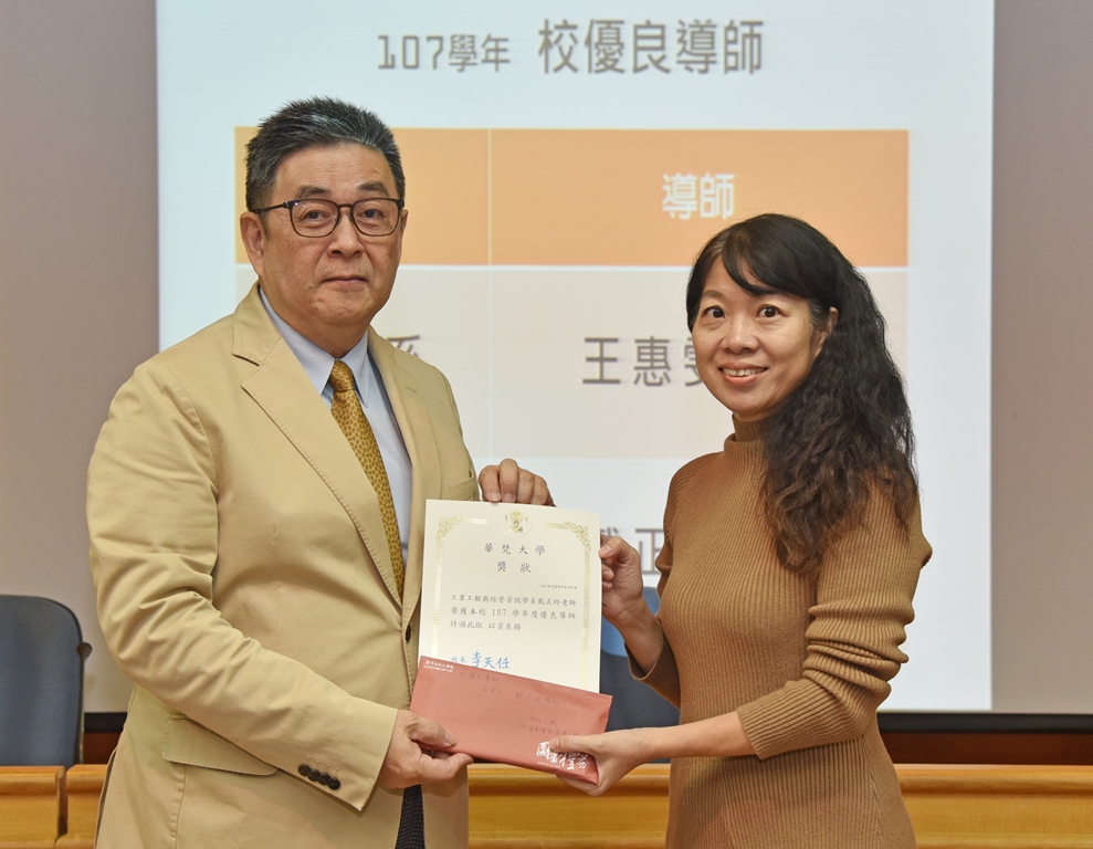 工業設計學系陳蔚文教授榮獲「107學年度系優良導師」,由工業設計學系陳顯榮教授(右)代表領獎。