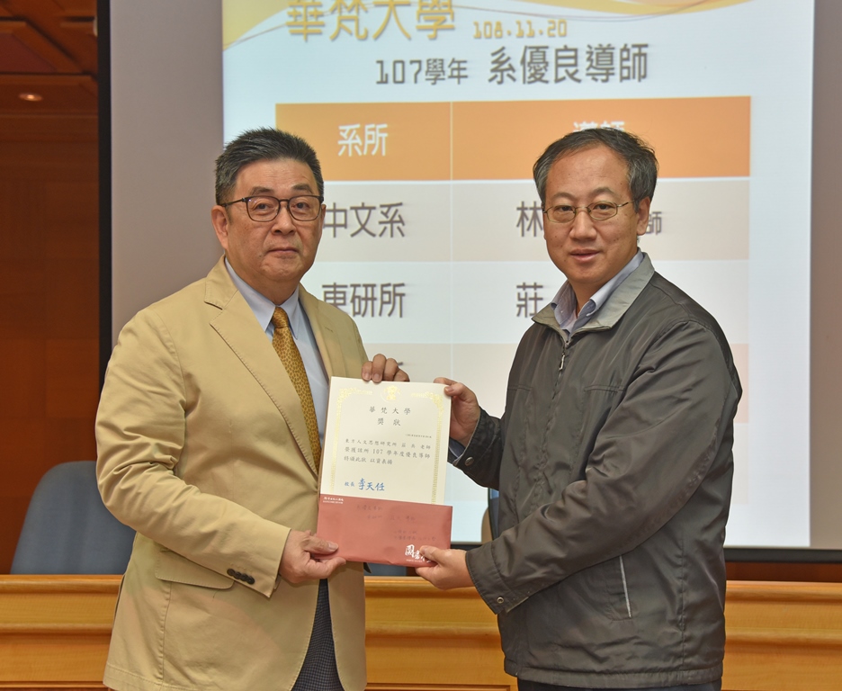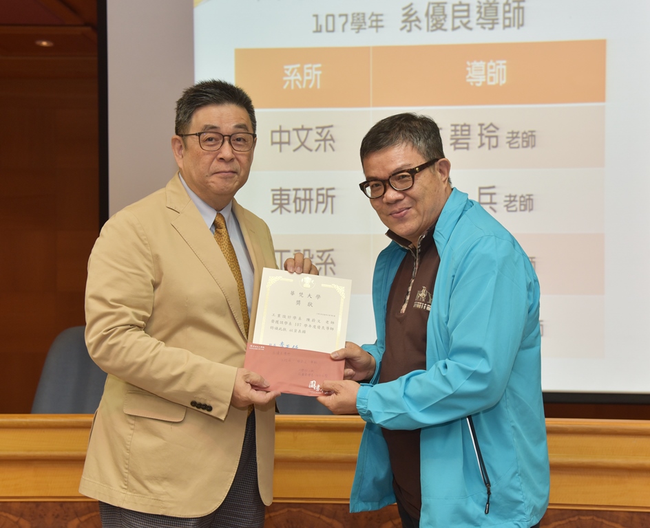 東方人文思想研究所莊兵所長(右)榮獲「107學年度系優良導師」。