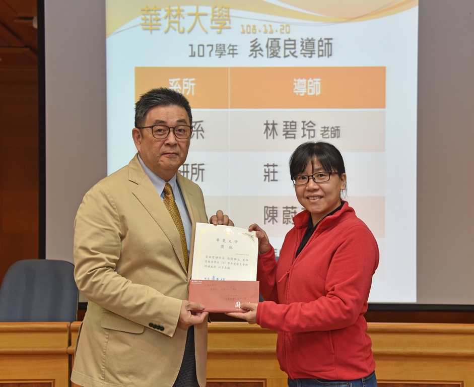 華梵大學107學年度優良導師名單於11月20日揭曉,哲學系王惠雯教授以及工業工程與經營資訊學系戴正玲教授雙雙榮獲「校優良導師」,中國文學系林碧玲教授、東方人文思想研究所莊兵所長、工業設計學系陳蔚文教授、資訊管理學系張簡雅文教授等4人獲頒「系優良導師」殊榮。