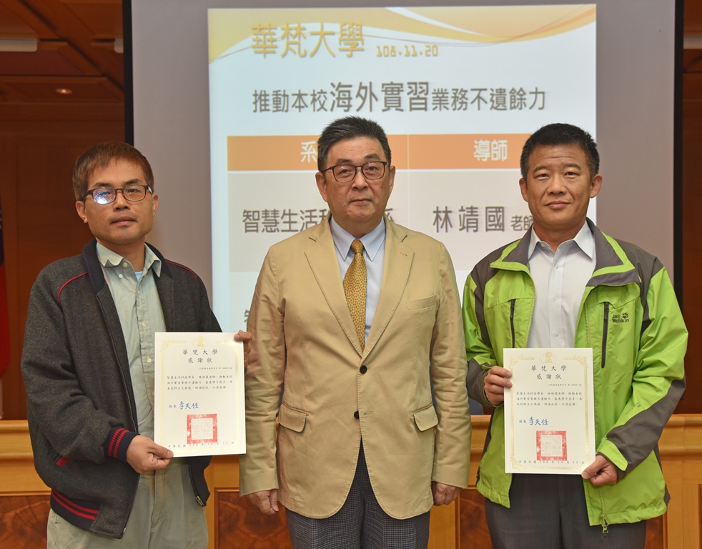 智慧生活科技學系林靖國教授(右)與陳淮義教授(左)因推動本校海外實習業務不遺餘力,與6名優良導師同獲李天任校長頒獎表揚。