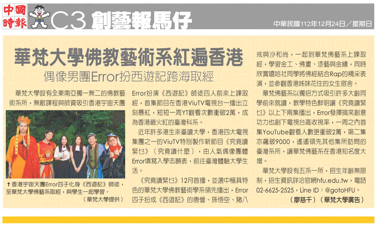 華梵大學設有全東南亞獨一無二的佛教藝術系所,獨特課程與專業師資吸引香港偶像團體Error扮演《西遊記》師徒四人前來取經。首集節目在香港ViuTV電視台一播出立刻爆紅,短短一周YouTube觀看次數已衝破2萬,成為現在香港最火紅的台灣科系。