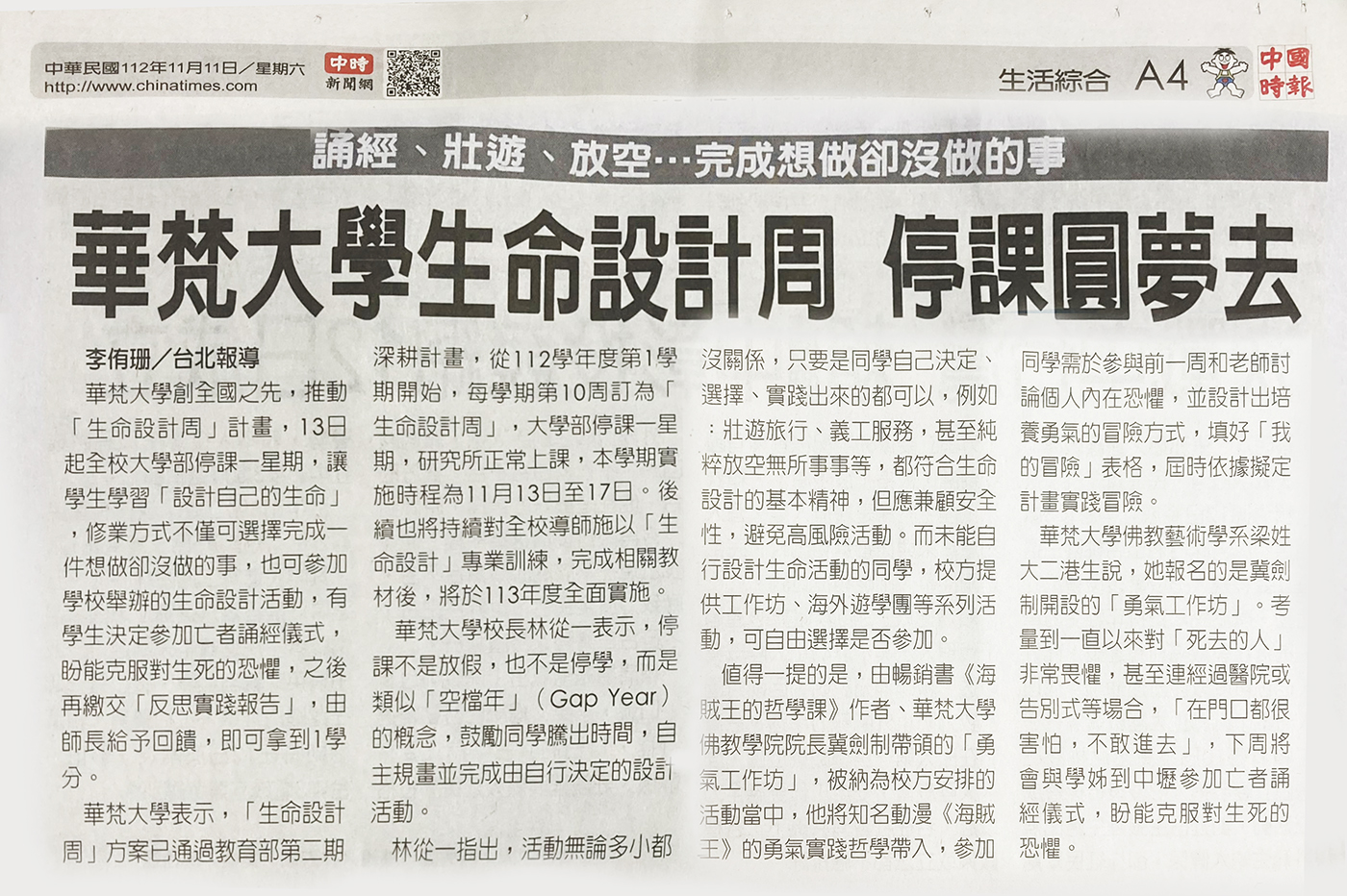 華梵大學創全國之先推動「生命設計周」計畫,下周一(13日)起全校大學部停課一周,讓學生學習「設計自己生命」,例如學習「海賊王」冒險,完成一件想做卻一直沒做的事,也可選擇參加學校舉辦的生命設計活動,再繳交「反思實踐報告」,由師長給予回饋即可拿到一學分。