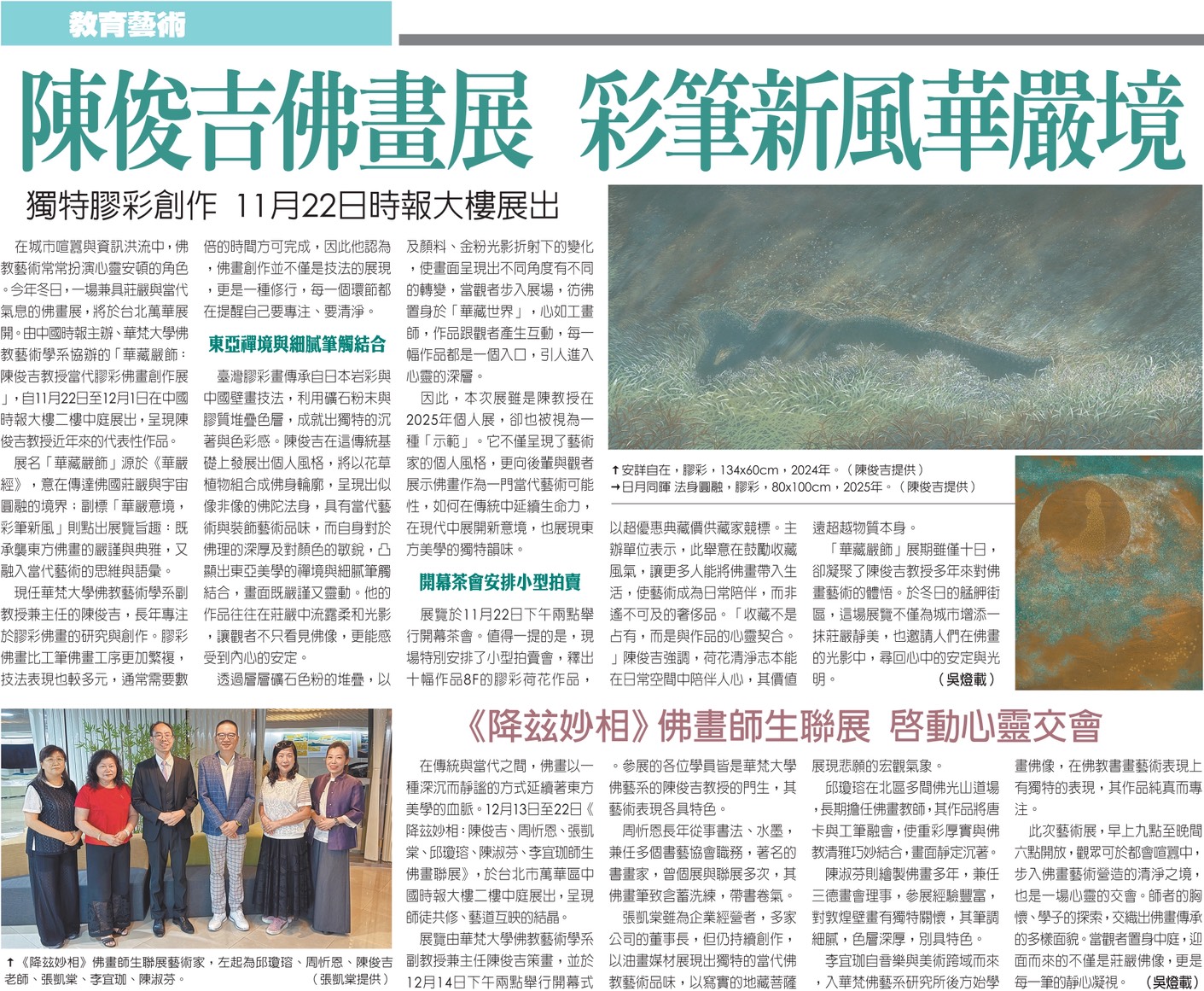在傳統與當代之間,佛畫以一種深沉而靜謐的方式延續著東方美學的血脈。12月13日至22日《降玆妙相:陳俊吉、周忻恩、張凱棠、邱瓊瑢、陳淑芬、李宜珈師生佛畫聯展》,於台北市萬華區中國時報大樓二樓中庭展出,呈現師徒共修、藝道互映的結晶。展覽由華梵大學佛教藝術學系副教授兼主任陳俊吉策畫,並於12月14日下午兩點舉行開幕式。參展的各位學員皆是華梵大學佛藝系的陳俊吉教授的門生,其藝術表現各具特色。