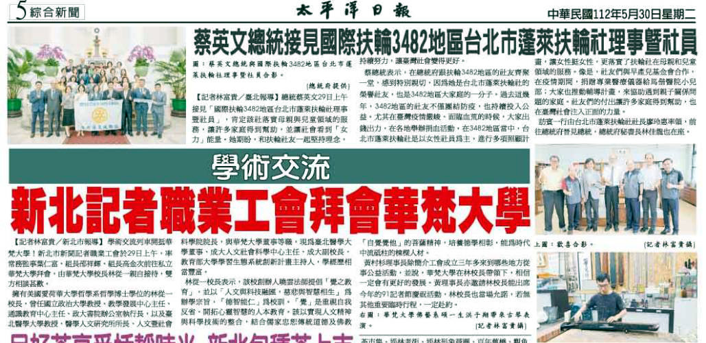 詳見全文: 中央社 https://www.cna.com.tw/postwrite/chi/343003 酷新聞 https://kro9988.blogspot.com/2023/05/blog-post_236.html 臺灣好報 新北記者職業工會拜會華梵大學 肯定華梵為臺灣高教創造未來 臺灣捷報 https://n.yam.com/Article/20230529202689 民眾日報 https://today.line.me/tw/v2/article/DRy1OYw 引新聞 https://innews.com.tw/107230/ 視傳媒 https://www.nvns.net/news_view.php?new_sn=36714 太平洋日報: