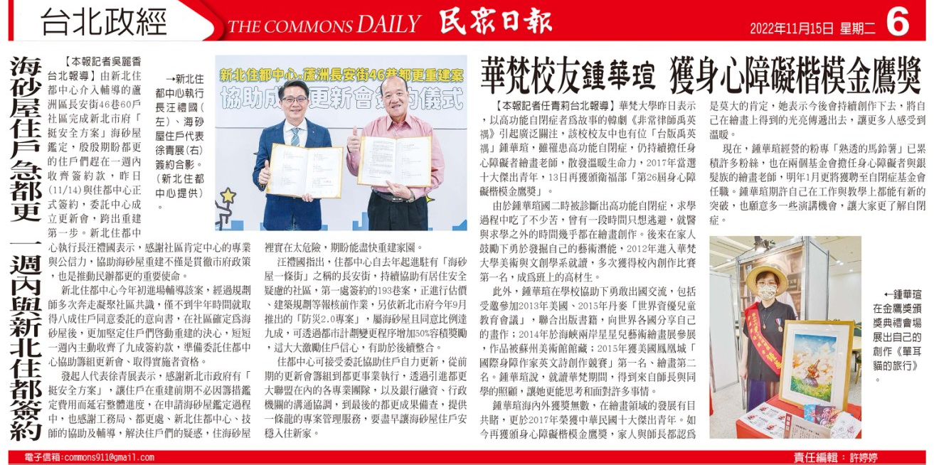 華梵大學昨日表示,以高功能自閉症者為故事的韓劇《非常律師禹英禑》引起廣泛關注,該校校友中也有位「台版禹英禑」鍾華瑄,雖罹患高中能自閉症,仍持續擔任身心障礙者繪畫老師,散發溫暖生命力,2017年當選十大傑出青年,13日再獲頒衛福部「第26屆身心障礙楷模金鷹獎」。