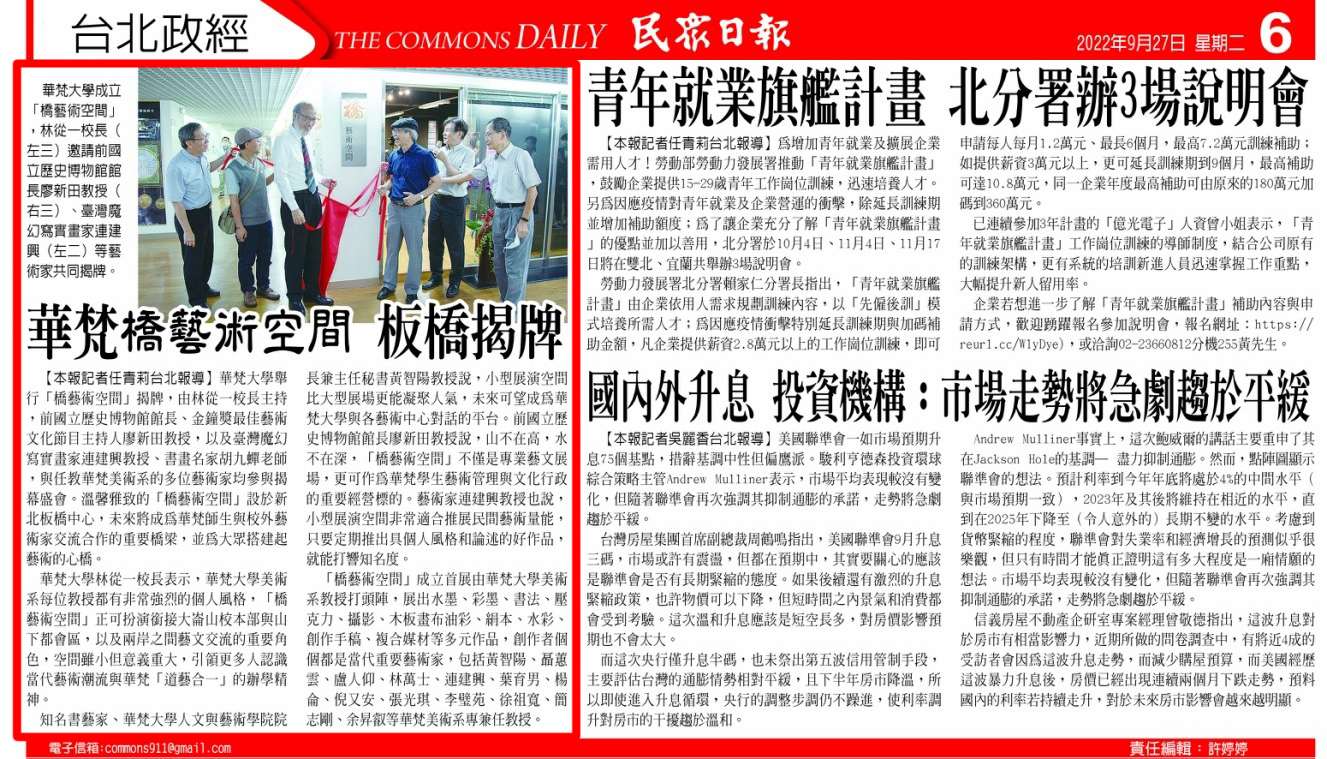 華梵大學舉行「橋藝術空間」揭牌,由林從一校長主持,前國立歷史博物館館長、金鐘獎最佳藝術文化節目主持人廖心田教授,以及臺灣魔幻寫實畫家連建興教授、書畫名家胡九蟬老師,與任教華梵美術系的多位藝術家均參與揭幕盛會。
