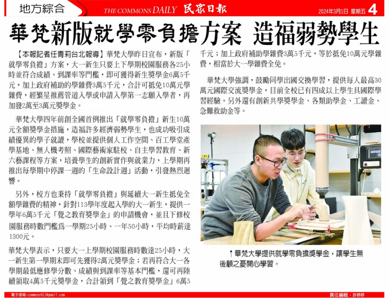 大學學測成績出爐,華梵大學祭出新版「就學零負擔」方案,大一新生只要上下學期校園服務各25小時並符合成績、到課率等門檻,即可獲得新生獎學金6萬5千元,加上政府補助的學雜費3萬5千元,合計可抵免10萬元學雜費,相當於免學費入學;經繁星推薦管道入學或申請入學第一志願入學者,更再加發2萬至3萬元獎學金。