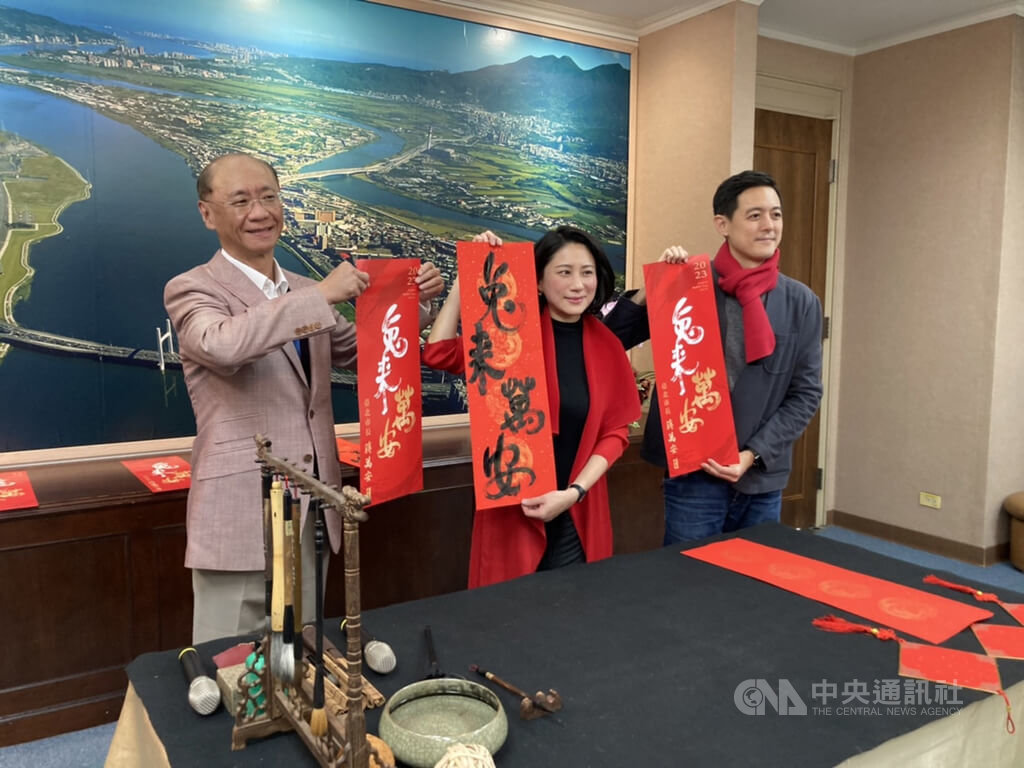 台北市兔年春聯亮相,由華梵大學美術與文創學系碩士校友書法家王貞懿(上圖中)揮毫寫下「兔來萬安」。