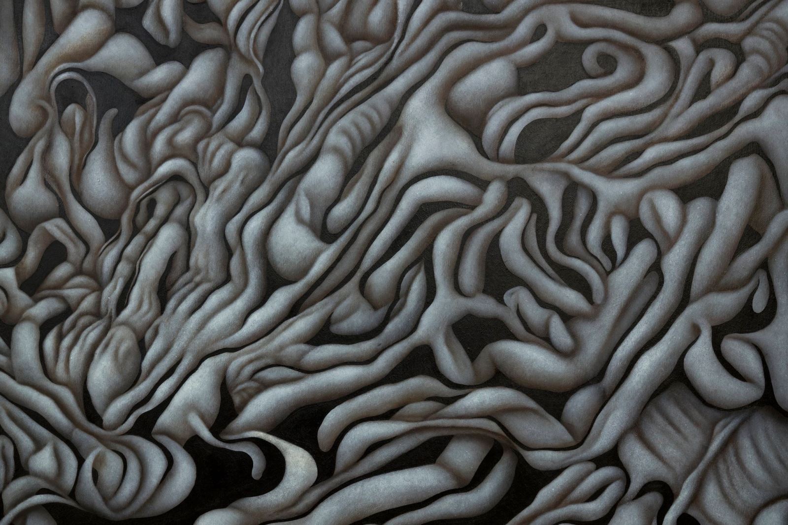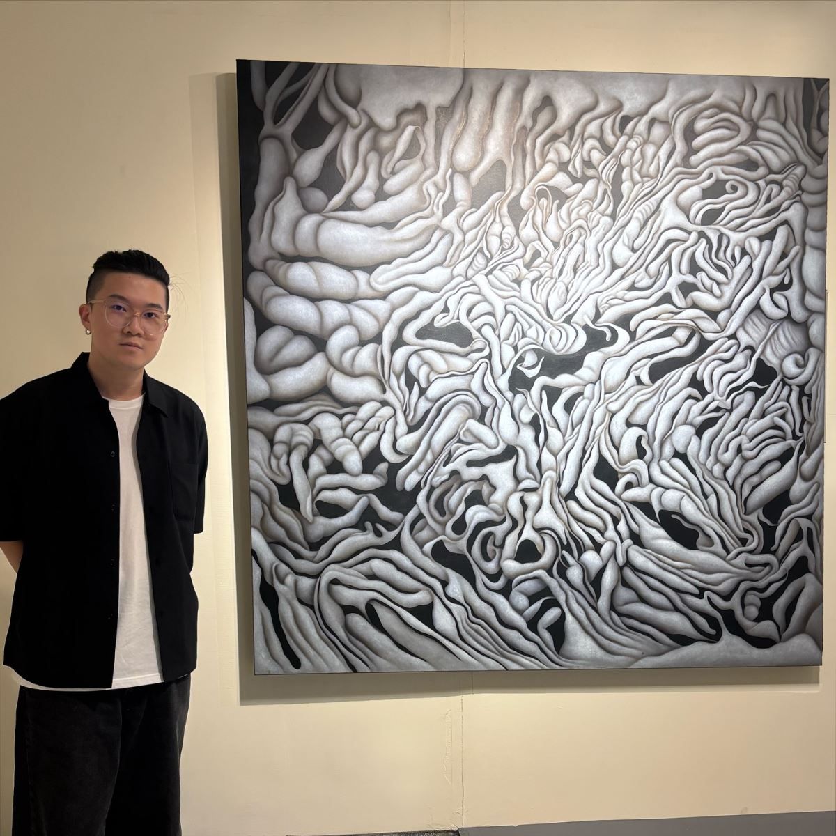 今年年輕新秀表現亮眼,其中,油畫類第一名得主曲宣是20世代新銳藝術家,2020年畢業於華梵大學美術與文創學系,得獎作品〈貧瘠之間-共生〉大膽運用全黑白的圖像,來表現枯枝相互穿透、蔓生的各種姿態。