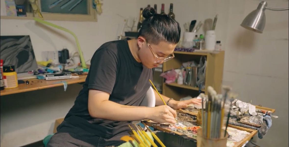 曲宣在工作室作畫情景。(摘自曲宣個人臉書)