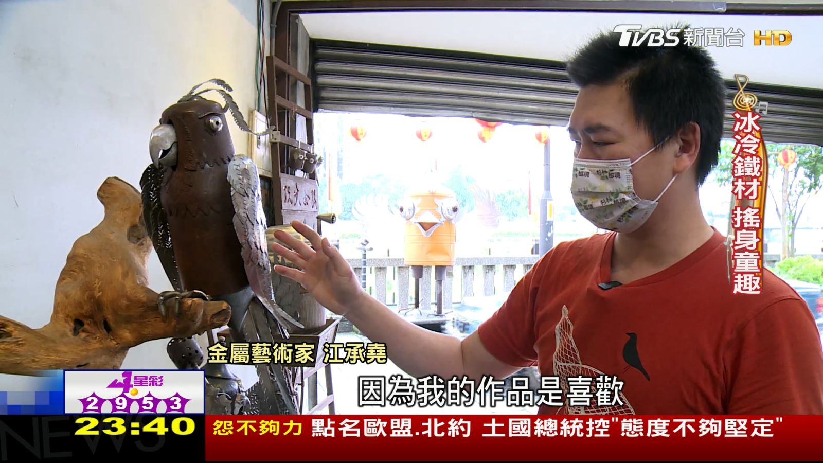 金屬藝術家江承堯:「從小在鐵工廠,看我爸爸工作長大的,因為我喜歡畫圖嘛,那我想說畫完之後,可不可以用我們家的材料來去創作東西,因為小時候我爸帶我去北美館,看藝術展覽,看到有人用鐵件來做東西,那我跟我爸講那個材料我們家也有,看完回家之後,就拿我們家材料直接動手做,那我就做一些小玩偶出來,那個時候就把它當玩具好玩。」