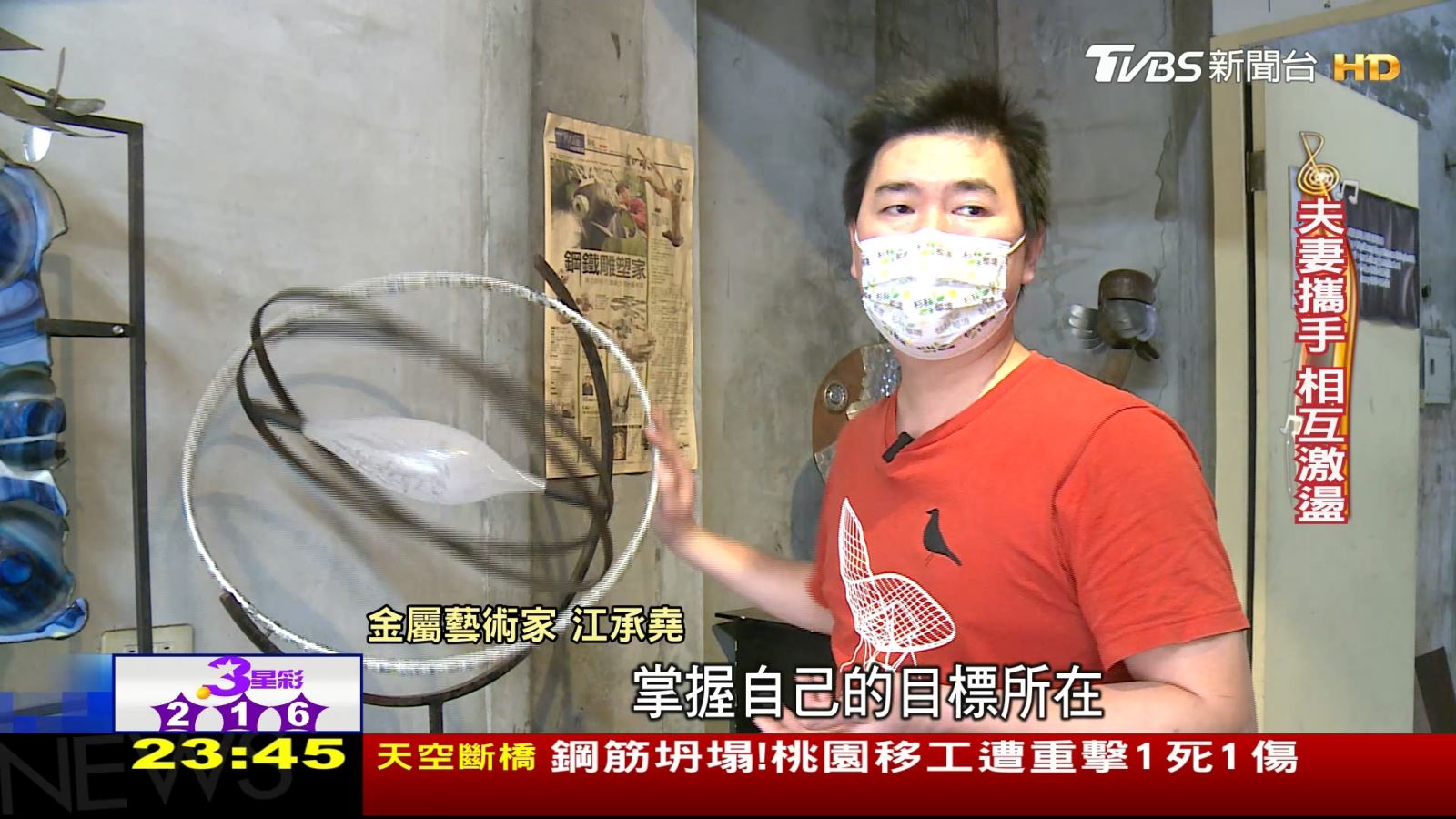 金屬藝術家江承堯:「她剛開始是找我學焊接,她當初想學焊接,是因為她做很多玻璃的話,必須要用鐵架,讓它表現出來,承受它的重量它的結構,但我幫她做了之後,她想這樣子不要太多複雜的東西支撐它,但我認為說,我覺得玻璃必須要用很好的結構,鐵件要夠好結構好,不會讓它倒,這樣討論啊。」